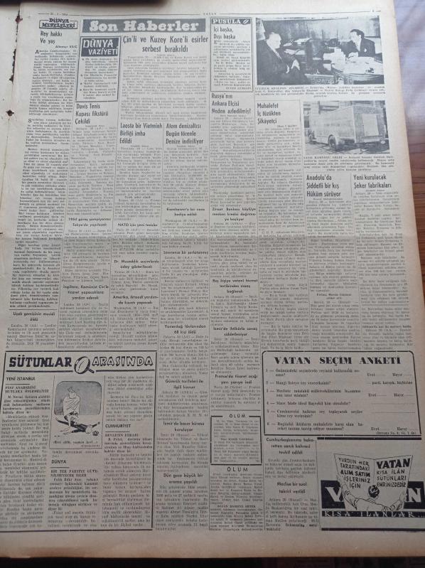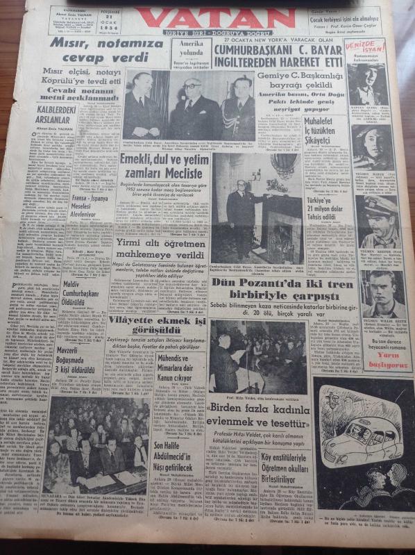 Vatan Gazetesi - 21 Ocak 1954 - Mısır Notamıza Cevap Verdi - Cumhurbaşkanı Celal Bayar İngiltere'den Hareket Etti - Galatasaray Lisesindeki Yirmi Altı Öğretmen Mahkemeye Verildi - Maldiv Cumhurbaşkanı Emin Didi Öldürüldü - Profesör Hıfzı Veldet Velidedeoğlu Çok Karılı Olmanın Kötülüklerini Açıklayan Konuşma Yaptı - Son Halife Abdülmecid'in Naaşı Getirilecek - Köy Enstitüleriyle Öğretmen Okulları Birleştiriliyor - Migros Satış Kamyonu Geldi - Göç Yolları Tıkadı Yazan İlhan Engin Yazı Dizisi - Malatya Kayısı Gecesi - Lawrence Bir Şarlatanmış - Trende Çekilenler Ve Konya Müzesi - 7. Konservatuar Konseri - Cem Kurt Çizen Bedri Koraman - Veba Yazan Albert Camus Yazı Dizisi - Oktay Akbal - Halide Edip Adıvar Sinekli Bakkal'ın Çevrilmesiyle Yakından Alakalanıyor- Emniyet Sandığı - Pan American - Avrupa Kibritleri - Şehir Tiyatrosu, Ahmet Emin Yalman tarafından kaleme alınmıştır. Vatan Gazetesi - 21 Ocak 1954 - Mısır Notamıza Cevap Verdi - Cumhurbaşkanı Celal Bayar İngiltere'den Hareket Etti - Galatasaray Lisesindeki Yirmi Altı Öğretmen Mahkemeye Verildi - Maldiv Cumhurbaşkanı Emin Didi Öldürüldü - Profesör Hıfzı Veldet Velidedeoğlu Çok Karılı Olmanın Kötülüklerini Açıklayan Konuşma Yaptı - Son Halife Abdülmecid'in Naaşı Getirilecek - Köy Enstitüleriyle Öğretmen Okulları Birleştiriliyor - Migros Satış Kamyonu Geldi - Göç Yolları Tıkadı Yazan İlhan Engin Yazı Dizisi - Malatya Kayısı Gecesi - Lawrence Bir Şarlatanmış - Trende Çekilenler Ve Konya Müzesi - 7. Konservatuar Konseri - Cem Kurt Çizen Bedri Koraman - Veba Yazan Albert Camus Yazı Dizisi - Oktay Akbal - Halide Edip Adıvar Sinekli Bakkal'ın Çevrilmesiyle Yakından Alakalanıyor- Emniyet Sandığı - Pan American - Avrupa Kibritleri - Şehir Tiyatrosu adlı eser Türkçe dilindedir.