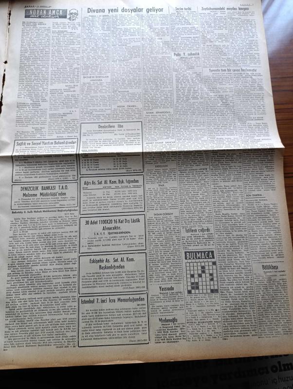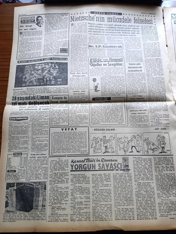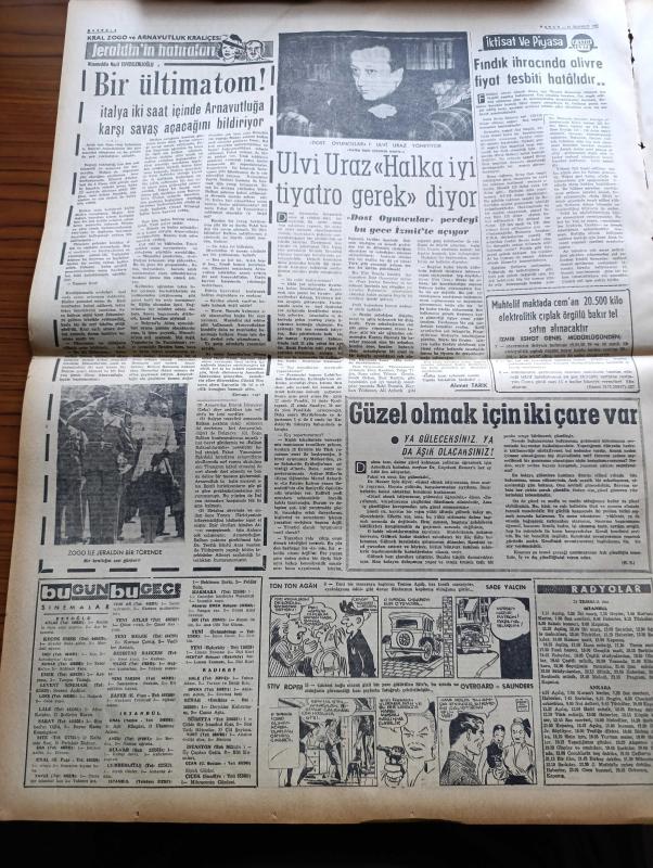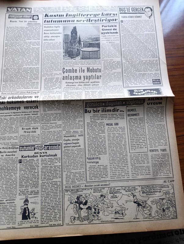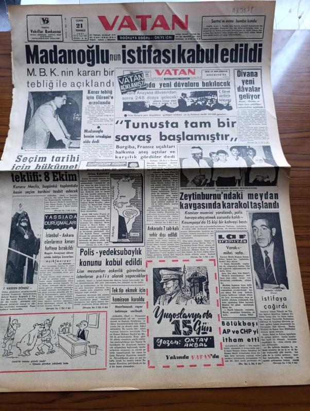 Vatan Gazetesi - 21 Temmuz 1961 - Cemal Madanoğlu'nun İstifası Kabul Edildi - Milli Birlik Komitesi'nin Kararı Bir Tebliğ İle Açıklandı - Seçim Tarihi İçin Hükümet Teklifi 8 Ekim - Yassıada Duruşmaları İstanbul Ankara Olaylarının Kararı Haftaya Bırakıldı - Tunus'ta Tam Bir Savaş Başlamıştır - Polis Yedeksubaylık Kanunu Kabul Edildi - Osman Bölükbaşı Adalet Partisi Ve CHP'yi İtham Etti - İstanbul Liman Tahmil Ve Tahliye İşçileri Sendikası Başkanı Muhittin Gezer - Tek Tip Ekmek İçin Komisyon Kuruldu - Kemal Tahir'in Romanı Yorgun Savaşçı Yazı Dizisi - 28 Yaşındaki Liman Talimatı Değişecek - Nietzsche'nin Mücadele Felsefesi - Portekiz Ginesi De Ayaklandı - Hoş Memo Karikatür - Kral Zogo Ve Arnavutluk Kraliçesi Jeraldin'in Hatıraları Yazan Nizameddin Nazif Tepedenlioğlu Yazı Dizisi - Ulvi Uraz Halka İyi Tiyatro Gerek Diyor - Dost Oyuncular Perdeyi Bu Gece İzmit'te Açıyor - Tonton Agah Çizgi Roman Sade Yalçın - Stiv Roper Çizen Saundes ve Overgard - Fikret Kırcan - Lefter Küçükandonyadis adlı eser, Kitap > Süreli Yayınlar > Gazeteler > Türkiye > Genel > Günlük kategorisinde İkinci El olarak satıştadır.