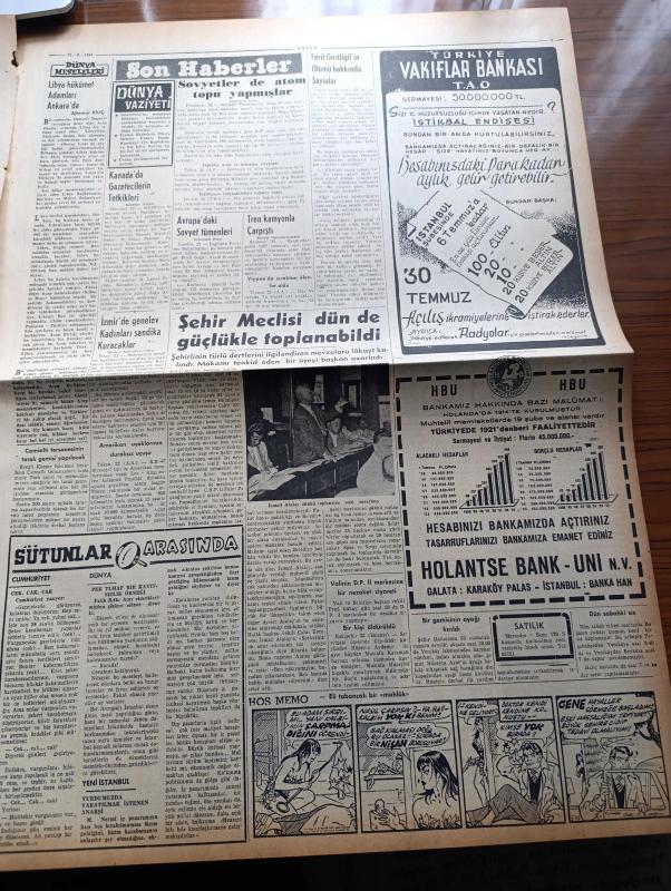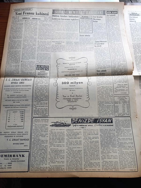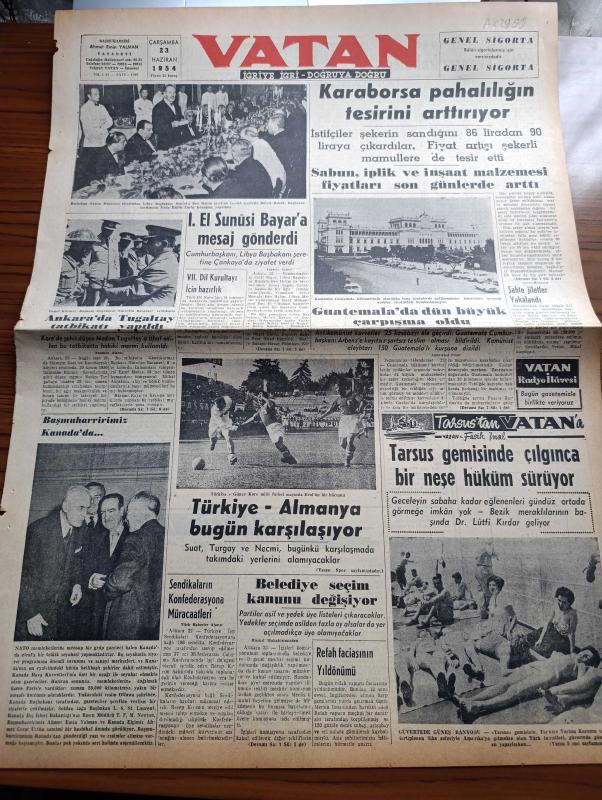 Vatan Gazetesi - 23 Haziran 1954 - İbni El Sunusi Celal Bayar'a Mesaj Gönderdi - Başbakan Adnan Menderes Tarafından Libya Başbakanı Mustafa Ben Halim'e Verilen Ziyafet - Karaborsa Pahalılığın Tesirini Arttırıyor - Guatemala'da Dün Büyük Çarpışma Oldu - Dünya Kupası Garaj Maçında Türkiye Almanya İle Karşılaşıyor - Sendikaların Konfederasyona Müracaatleri - Tarsus'tan Vatan'a Yazan Fasih İmal Yazı Dizisi - Belediye Seçim Kanunu Değişiyor - 12. Dil Kurultayı için Hazırlık - Denizde İsyan Yazan Herman Wouk Yazı Dizisi - Geçmişte Bugün Hatay Anavatana Kavuşuyor - Sovyetler De Atom Topu Yapmışlar - İzmir'de Genelev Kadınları Sendika Kuracaklar - General Ali Fuat Cebesoy'un Siyasi Hatıraları Yazı Dizisi - Pul Aleminin İçyüzü Derleyen Nur Sabuncuoğlu Yazı Dizisi - Vatan Radyo İlavesi - İstanbul Radyosu Stüdyo Mühendisinin Bir Bayan Olduğunu Biliyor Musunuz - Yüksek Mühendis Mualla Acar - Bu Yerin Ötesinde Yazan Cronin - Pal Traş Bıçağı - Radyolin - Türkiye Kore Milli Maçından Fotoğraf adlı eser, Kitap > Süreli Yayınlar > Gazeteler > Türkiye > Genel > Günlük kategorisinde İkinci El olarak satıştadır.