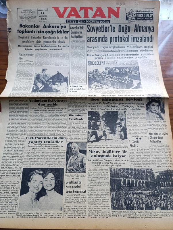 Vatan Gazetesi - 24 Ağustos 1953 - Hastalığımızın İlacı Yazan Ahmet Emin Yalman Köşe Yazısı - Bakanlar Ankara'ya Çağrıldılar - Acıbadem Demokrat Parti Ocağı Dün Açıldı - Sovyetler'le Doğu Almanya Arasında Protokol İmzalandı - Şah Devlet Hazinesinin Boş Olduğunu Söyledi - Japonya Karnaval Kraliçesi Miss Higgins Kamakura - Mau Mau'lar Teslim Olmaya Davet Edilecekler - Bir Dağın Ardı Yazan Muzaffer Hacıhasanoğlu Yazı Dizisi - Türkiye İş Bankası Çarşamba Günü 30 Yaşına Basıyor - Fotoğraflarla Haberler - Hoş Memo Karikatür - Mekke'de 105 Hacı Namzedi Öldü - Afrika'da 4 Ay Yazan Tunç Yalman Yazı Dizisi - İstanbul Kapılarında Fethin Büyük Tarihi Romanı Yazan Feridun Fazıl Tülbentçi Yazı Dizisi - Times Gazetesinin Seyyar Matbaası - Yunanlı Armatör Onasis - Yeni Bir Gün Doğacak Yazan Emmanuel Robles Yazı Dizisi - Ordu Atı Müsabakaları Dünkü Yarışmalarla Sona Erdi- Atletizmde İstanbul Etnikos'u Yendi - Fenerbahçe'nin Antrenman Maçı - Beyoğluspor Taksim Karşılaşması - Karakucak Güreşleri Sonlandı, Ahmet Emin Yalman tarafından kaleme alınmıştır. Vatan Gazetesi - 24 Ağustos 1953 - Hastalığımızın İlacı Yazan Ahmet Emin Yalman Köşe Yazısı - Bakanlar Ankara'ya Çağrıldılar - Acıbadem Demokrat Parti Ocağı Dün Açıldı - Sovyetler'le Doğu Almanya Arasında Protokol İmzalandı - Şah Devlet Hazinesinin Boş Olduğunu Söyledi - Japonya Karnaval Kraliçesi Miss Higgins Kamakura - Mau Mau'lar Teslim Olmaya Davet Edilecekler - Bir Dağın Ardı Yazan Muzaffer Hacıhasanoğlu Yazı Dizisi - Türkiye İş Bankası Çarşamba Günü 30 Yaşına Basıyor - Fotoğraflarla Haberler - Hoş Memo Karikatür - Mekke'de 105 Hacı Namzedi Öldü - Afrika'da 4 Ay Yazan Tunç Yalman Yazı Dizisi - İstanbul Kapılarında Fethin Büyük Tarihi Romanı Yazan Feridun Fazıl Tülbentçi Yazı Dizisi - Times Gazetesinin Seyyar Matbaası - Yunanlı Armatör Onasis - Yeni Bir Gün Doğacak Yazan Emmanuel Robles Yazı Dizisi - Ordu Atı Müsabakaları Dünkü Yarışmalarla Sona Erdi- Atletizmde İstanbul Etnikos'u Yendi - Fenerbahçe'nin Antrenman Maçı - Beyoğluspor Taksim Karşılaşması - Karakucak Güreşleri Sonlandı adlı eser Türkçe dilindedir.