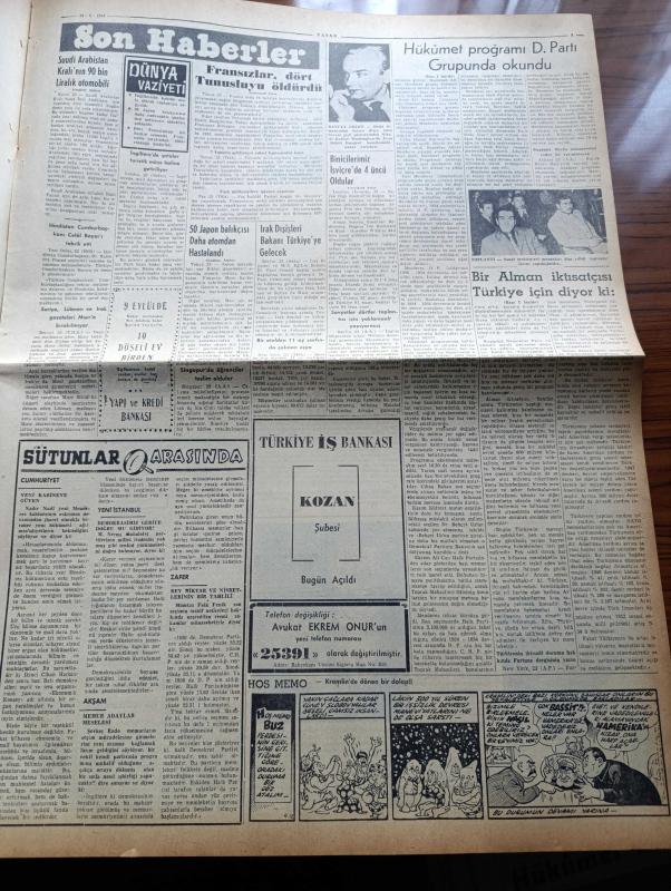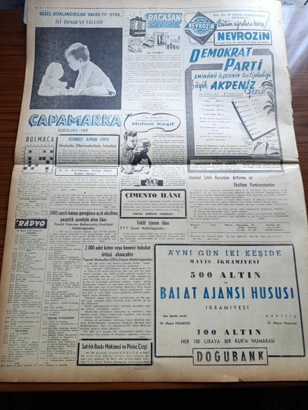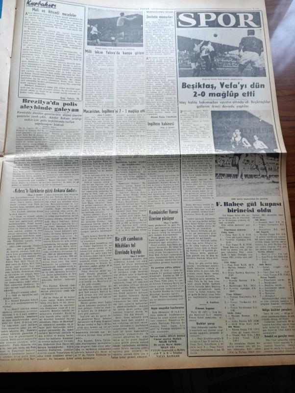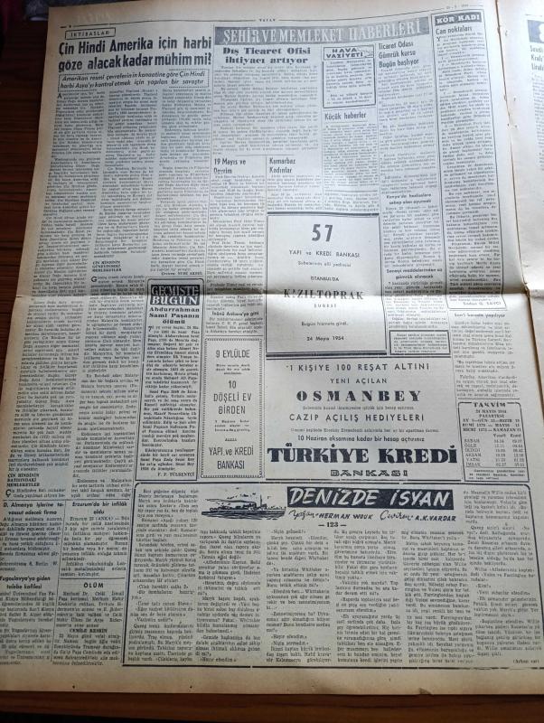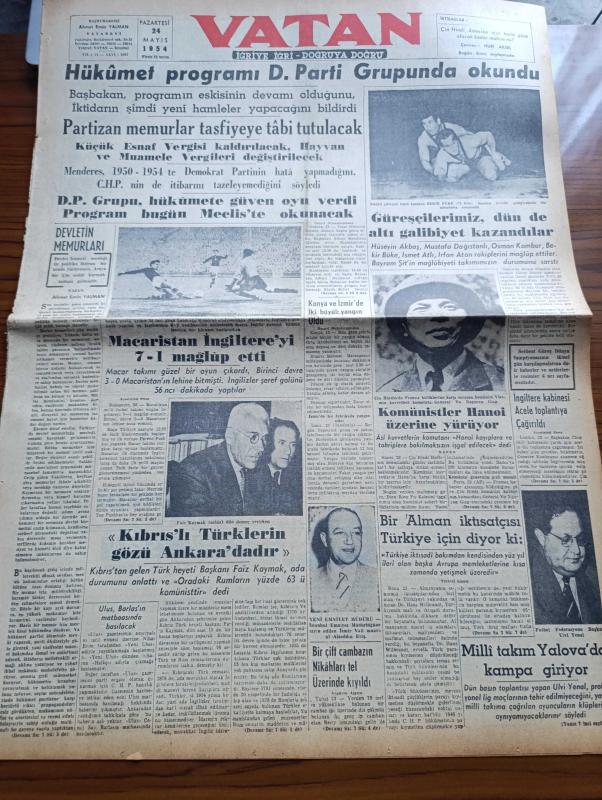 Vatan Gazetesi - 24 Mayıs 1954 - Ahmet Emin Yalman Köşe Yazısı - Hükümet Programı Demokrat Parti Grubunda Okundu - Partizan Memurlar Tasfiyeye Tabi Tutulacak - Komünistler Hanoi Üzerine Yürüyor - Macaristan İngiltere'yi 7 1 Mağlup Etti- Faiz Kaymak Kıbrıs'ta Rumların Yüzde 63'ü Komünisttir Dedi - Futbol Federasyonu Başkanı Ulvi Yenal - Güreşçilerimiz Dün De Altı Galibiyet Kazandılar - İstanbul Emniyet Müdürü Alaeddin Eriş Oldu - Bir Çift Cambazın Nikahı Tel Üzerinde Kıyıldı - Denizde İsyan Yazan Herman Wouk Yazı Dizisi - 50 Japon Balıkçısı Daha Atomdan Hastalandı - Suudi Arabistan Kralı'nın 90 Bin Liralık Otomobili - Hoş Memo Karikatür - Sanat Aleminde Adalet Cimcoz Maya'nın Durumunu İzah Ediyor - General Ali Fuat Cebesoy'un Siyasi Hatıraları Yazı Dizisi - Migros Karşısında Esnafın Endişesi - Kalay Kralının Kızı İsabelle Patino'nun Hazin Akıbeti - Jigolo Yazan Daniel Harper Yazı Dizisi - Tokyo Serbest Güreş Dünya Şampiyonası - Beşiktaş Vefa'yı Dün 2 0 Mağlup Etti - Fenerbahçe adlı eser, Kitap > Süreli Yayınlar > Gazeteler > Türkiye > Genel > Günlük kategorisinde İkinci El olarak satıştadır.