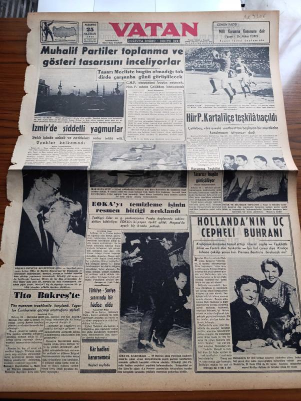 Vatan Gazetesi - 25 Haziran 1956 - Muhalif Partiler Toplanma Ve Gösteri Tasarısını İnceliyorlar - İzmir'de Şiddetli Yağmurlar - Fenerbahçe'nin Vefa'yı Yendiği Maçtan Fotoğraf - Mareşal Tito Bükreş'te - EOKA'yı Temizleme İşinin Resmen Bittiği Açıklandı - Türkiye Suriye Sınırında Bir Hadise Oldu - Irak Hava Gücü - Hava Kahramanları Yazan Joseph Kessel Yazı Dizisi - Milli Korunma Kanununa Dair Yazan Doktor Nihat Türel - Tek Kelime Konuşulmayan Sağır Ve Dilsizler Cemiyeti Kongresi - Geçmişte Bugün Sultan Abdülmecid'in Ölümü - Irak Kralı Türkkuşu Ekibini Kabul Etti - Hoş Memo Karikatür - Sovyet Havacılık Gösterileri Yağmur Altında Yapıldı - İstanbul Radyosunun 31 Yaşındaki Müdürü Doktor Nevzat Atlığ - General Ali Fuat Cebesoy'un Siyasi Hatıraları Yazı Dizisi - Cimcimeler Karikatür - Ella Sinders Karikatür - Pıtırcıkla Babası Karikatür - Amerika'yı Altüst Eden İpnotizma - Jeanne D'arc'ın 500. Yıldönümü Kutlandı - Sofya Enternasyonal Atletizm Müsabakaları - Tenis Federasyonu Faaliyet Programı adlı eser, Kitap > Süreli Yayınlar > Gazeteler > Türkiye > Genel > Günlük kategorisinde İkinci El olarak satıştadır.