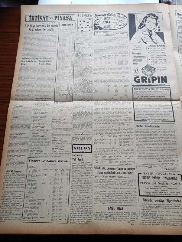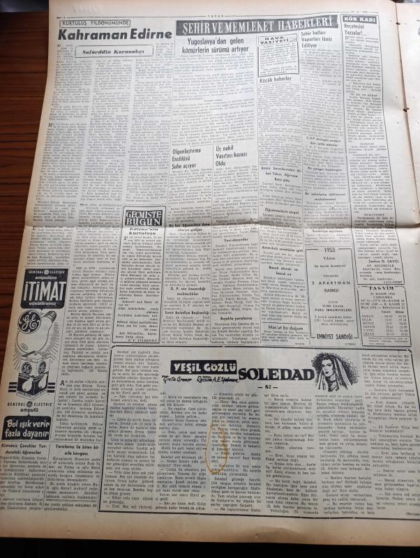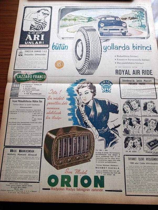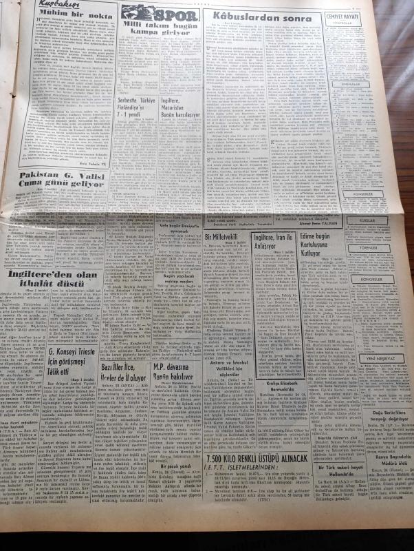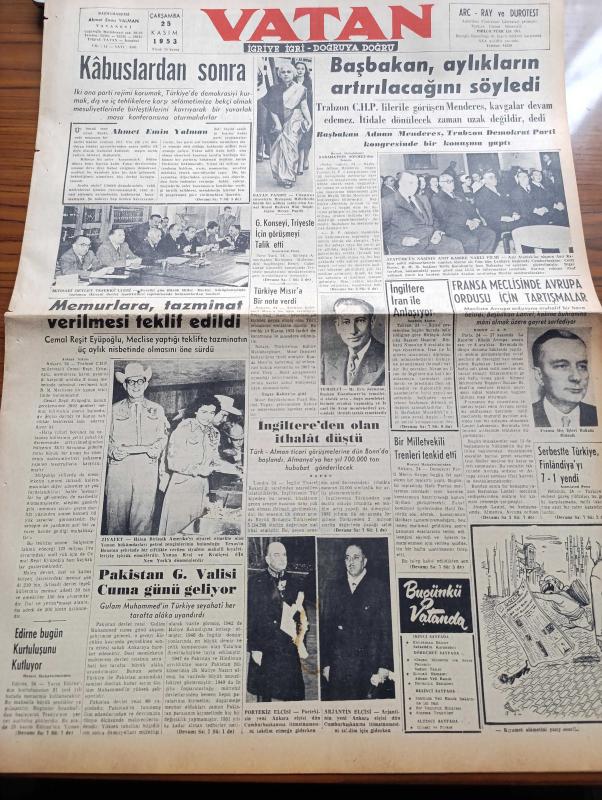 Vatan Gazetesi - 25 Kasım 1953 - Kabuslardan Sonra Yazan Ahmet Emin Yalman Köşe Yazısı - Memurlara Tazminat Verilmedi Teklif Edildi - Edirne Bugün Kurtuluşunu Kutluyor - Pakistan Devlet Reisi Gulam Muhammed Cuma Günü Geliyor - Türkiye Mısır'a Bir Nota Verdi- İngiltere'den Olan İthalat Düştü - Başbakan Adnan Menderes Aylıkların Artırılacağını Söyledi - Atatürk'ün Naşının Anıtkabir'e Nakli Filmi - Yeşil Gözlü Soledad Yazan Greta Granor Yazı Dizisi - Olgunlaştırma Enstitüsü Şube Açıyor - Bozuk Ekmek Ve Bozuk Un - Şehir Hatları Vapurları Tamir Ediliyor - Konya'da Erkek Olan Kadın İntihar Etti - Hoş Memo Karikatür - Kılıçali Hamamı Yazan Adnan Veli Yazı Dizisi - Amerikan Havacılığı Hamle Yapıyor - Avni Dilligil Nevin Aypar Ve Aliye Rona Mahallenin Namusu Filminde Fotoğraf - Folklorcu Beli Kanık - Vefa Bugün Emniyetle Oynayacak - Millet Partisi Davasına Bugün Bakılıyor - Royal Air Ride Lastik - Arı Unları - Orion Radyo - Lazzaro Franco Kumaş - Poker Play Traş Bıçağı - Pal Traş Bıçağı adlı eser, Kitap > Süreli Yayınlar > Gazeteler > Türkiye > Genel > Günlük kategorisinde İkinci El olarak satıştadır.