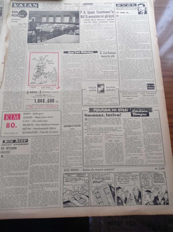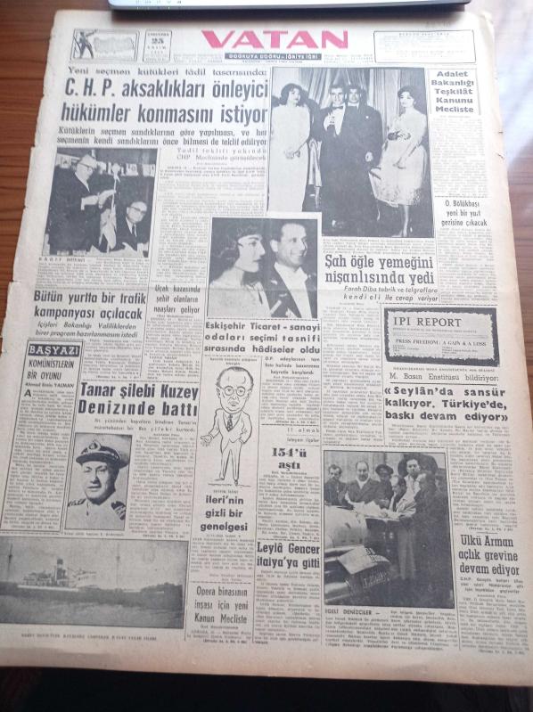 Vatan Gazetesi - 25 Kasım 1959 - İran Şahı Muhammed Rıza Pehlevi Öğle Yemeğini Nişanlısında Yedi - Komünistlerin Bir Oyunu - Değerli Soprano Leyla Gencer İtalya'ya Gitti - Ulus Gazetesi Yazı İşleri Müdürü Ülkü Arman Açlık Grevine Gidiyor - Seylan'da Sansür Kalkıyor Türkiye'de Baskı Devam Ediyor - Osman Bölükbaşı Yeni Bir Yurt Gezisine Çıkacak - Yirmi Kadar İlçe İl Olmak İçin Kapıda Beklerken - Eczacıbaşı İlk Türk İlaç Fabrikası - Duru Göl İlhan Tarus'un Romanı Yazı Dizisi - Kim Haftalık Haber Dergisi - Komünist Çin Butana Tecavüz Etti - Haldun Dormen Sahnesi - Naim Tirali - Coşkun Kırca - Sadun Tanju - Noyan Amca Dert Dinliyor - Başbakan Adnan Menderes Edirne'ye Gidiyor - Devlet Tiyatrosu Yılbaşında Açılıyor - Bugün Yapılacak Tek Milli Lig Maçı Fenerbahçe İstanbulspor- Almanya Ve Olimpiyat Oyunları - İstanbul Boks Birinciliği - Beykoz Antrenörü İbrahim Tusler Vazifesine Döndü - Neriman Tekil, Ahmet Emin Yalman tarafından kaleme alınmıştır. Vatan Gazetesi - 25 Kasım 1959 - İran Şahı Muhammed Rıza Pehlevi Öğle Yemeğini Nişanlısında Yedi - Komünistlerin Bir Oyunu - Değerli Soprano Leyla Gencer İtalya'ya Gitti - Ulus Gazetesi Yazı İşleri Müdürü Ülkü Arman Açlık Grevine Gidiyor - Seylan'da Sansür Kalkıyor Türkiye'de Baskı Devam Ediyor - Osman Bölükbaşı Yeni Bir Yurt Gezisine Çıkacak - Yirmi Kadar İlçe İl Olmak İçin Kapıda Beklerken - Eczacıbaşı İlk Türk İlaç Fabrikası - Duru Göl İlhan Tarus'un Romanı Yazı Dizisi - Kim Haftalık Haber Dergisi - Komünist Çin Butana Tecavüz Etti - Haldun Dormen Sahnesi - Naim Tirali - Coşkun Kırca - Sadun Tanju - Noyan Amca Dert Dinliyor - Başbakan Adnan Menderes Edirne'ye Gidiyor - Devlet Tiyatrosu Yılbaşında Açılıyor - Bugün Yapılacak Tek Milli Lig Maçı Fenerbahçe İstanbulspor- Almanya Ve Olimpiyat Oyunları - İstanbul Boks Birinciliği - Beykoz Antrenörü İbrahim Tusler Vazifesine Döndü - Neriman Tekil adlı eser Türkçe dilindedir.