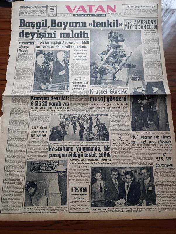 Vatan Gazetesi - 25 Mart 1961 - Ali Fuat Başgil Celal Bayar'ın Tenkil Deyişini Anlattı - Profesör Doktor Yavuz Abadan Köşe Yazısı - Kruşçef Cemal Gürsel'e Mesaj Gönderdi - Hacettepe Hastanesi Yangınında Bir Çocuğun Öldüğü Tesbit Edildi - Bir Amerikan Filosu Dün Geldi - Demokrat Parti Oylarının Elde Edilmesi Yarışı Esef Verici Hadisedir - Yeni Türkiye Partisi'nin Deklarasyonu - Aziz Nesin'in Romanı Kağnı Gölgesindeki İt Yazı Dizisi - Servet Beyannamesinin Veriliş Şekli Açıklandı - Kennedy Basın Toplantısında Laos Meselesi Üzerinde Önemle Durdu - Oktay Akbal Köşe Yazısı - Büyük Türk Şairi Ali Şir Nevai - Taş Devri Çizen Mıstık - Stiv Roper Çizen Saundes Ve Overgard - Artist Kim Novak - İstanbul Ankara Radyosu Programı - Yassıada Duruşmaları - Bugün 5 Çetin Milli Lig Maçı Var - Fenerbahçe Dün İzmir'e Gitti - Türkiye Futbol Birinciliği Final Maçları Başlıyor adlı eser, Kitap > Süreli Yayınlar > Gazeteler > Türkiye > Genel > Günlük kategorisinde İkinci El olarak satıştadır.
