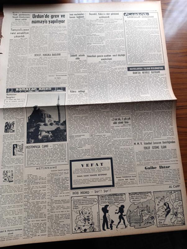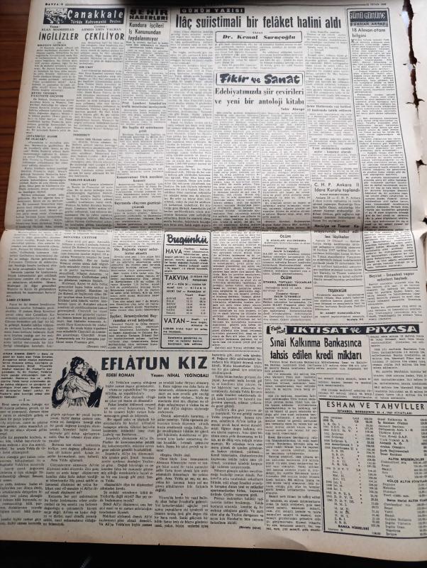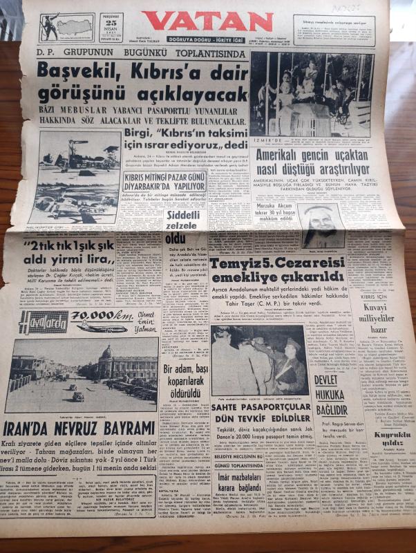 Vatan Gazetesi - 25 Nisan 1957 - Başvekil Adnan Menderes Kıbrıs'a Dair Görüşünü Açıklayacak - Kıbrıs Mitingi Pazar Günü Diyarbakır'da Yapılıyor - Amerikalı Genç John Rodney Nash'ın Uçaktan Nasıl Düştüğü Araştırılıyor - Temyiz 5. Ceza Reisi Necmettin Arvas Emekliye Çıkarıldı - İran'da Nevruz Bayramı - Sahte Pasaportçular Dün Tevkif Edildiler - Kıbrıs İçin Kuvayi Milliyeliler Hazır - Merzuka Akçam Tekrar 30 Yıl Hapse Mahkûm Edildi - Çanakkale Türk'ün Kahramanlık Destanı Yazan Alan Moorehead Yazı Dizisi - Eflatun Kız Yazan Nihal Yeğinobalı Yazı Dizisi - Edebiyatımızda Şiir Çevirileri Ve Yeni Bir Antoloji Kitabı - Ramazan Köşesi - Havalarda 70.000 Kilometre Yazan Ahmet Emin Yalman - Maksim Bar Yıldızı Ve İstanbul Kolin Mur'u Hala Alkış Topluyor - 1001 Gece Masalları Hazırlayan Suat Taşer Yazı Dizisi - Batakhane İnsanları Yazan Adnan Veli Yazı Dizisi - Galatasaray Beşiktaş'ı 2 0 Mağlup Etti - Basketbolda Amerika Namzetleri 64 43 Yendi - At Yarışları Programı - Buk Rocers Çizen Rick Yager adlı eser, Kitap > Süreli Yayınlar > Gazeteler > Türkiye > Genel > Günlük kategorisinde İkinci El olarak satıştadır.