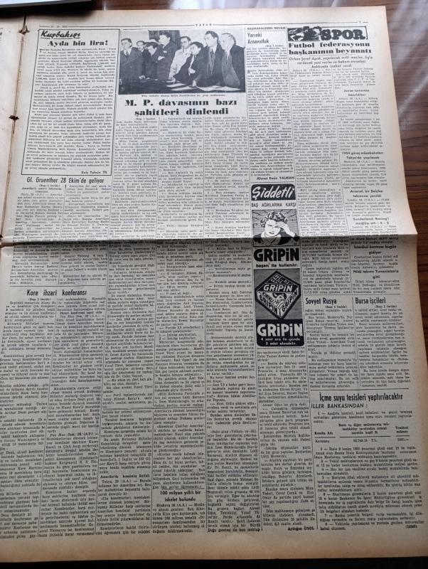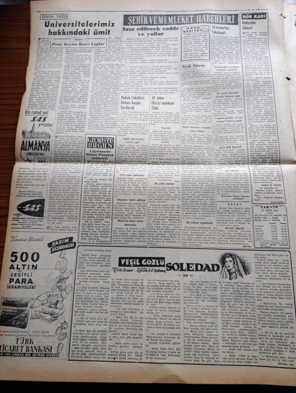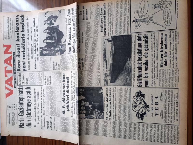 Vatan Gazetesi - 27 Ekim 1953 - Ahmet Emin Yalman Köşe Yazısı - Narlı Gaziantep Hattı Dün İşletmeye Açıldı - Millet Partisi Davasının Bazı Şahitleri Dinlendi - Millet Partisi Davasına 3. Sulh Ceza Bakacak - Avrupa'daki Müttefik Komutanlığı Başkomutanı General Gruenther 28 Ekim'de Geliyor - İran Başbakanı Zahidi Türk İran Dostluğu Zarurettir Dedi - Gizli Nurculuk Teşkilatına Dair Yeni Bir Vesika Ele Geçmiştir - Saidi Kürdi - Yeşil Gözlü Soledad Yazan Greta Granor Yazı Dizisi - Deniz Adamları Sendikası - Amerika'nın Hür Memleketlere Mali Yardımı Sona Eriyor - Adana'nın yeni Telefon Santralı Açıldı - Afrika'da 4 Ay Yazan Tunç Yalman Yazı Dizisi - Beyazların Kokteyli Ve Zenci Koro Konseri - Sinema Tenkidleri Atilla İlhan - İstanbul Kapılarında Fethin Büyük Tarihî Romanı Yazan Feridun Fazıl Tülbentçi Yazı Dizisi - Albert Einstein Tıp Akademisi Kuruluyor - Kısa Pantaloluların Goncourt Mükâfatı - Borsa - Puro Tuvalet Sabunu - Futbol Federasyonu Başkanı Orhan Şeref Apak'ın Beyanatı - Arsenal adlı eser, Kitap > Süreli Yayınlar > Gazeteler > Türkiye > Genel > Günlük kategorisinde İkinci El olarak satıştadır.