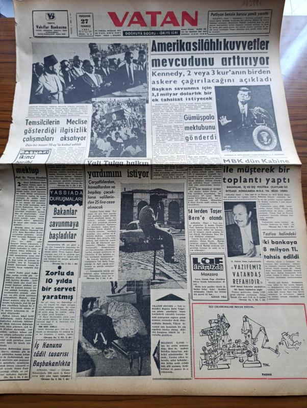 Vatan Gazetesi - 27 Temmuz 1961 - ikinci Tarihi Mektup Yazan Profesör Doktor Yavuz Abadan Köşe Yazısı - Amerika Silahlı Kuvvetler Mevcudunu Arttırıyor - Ragıp Gümüşpala Mektubunu Gönderdi - Vali Refik Tulga Halkın Yardımını İstiyor - Çarşaflılardan Hamallardan Ve Başıboş Çocukların Velilerinden 25 Lira Ceza Alınacak - Fatin Rüştü Zorlu'da 10 Yılda Bir Servet Yaratmış - İş Kanunu Tadil Tasarısı Başbakanlık'ta - Kemal Tahir'in Romanı Yorgun Savaşçı Yazı Dizisi - Veznedarlar Silahlı Olacak - 57 Ünlü Tablo Çalındı - Şişli Yenikapı Troleybüs Hattı - Empresyonist Ressamlar - Yugoslavya'da 15 Gün Yazan Oktay Akbal Köşe Yazısı - Kral Zogo Ve Arnavutluk Kraliçesi Jeraldin'in Hatıraları Yazan Nizameddin Nazif Tepedenlioğlu Yazı Dizisi - Üçüncü Dünya Savaşı Mı - Tonton Agah Çizgi Roman Sade Yalçın - Stiv Roper Çizen Saundes ve Overgard - Cezayir Türküsü Yazan Vecihi Timuroğlu - Yassıada Duruşmaları - Şeref Has Roma'dan Barselona'ya Şükrü Gülesin İle Beraber Gidecek - Antrenör Coşkun Özarı, Ahmet Emin Yalman tarafından kaleme alınmıştır. Vatan Gazetesi - 27 Temmuz 1961 - ikinci Tarihi Mektup Yazan Profesör Doktor Yavuz Abadan Köşe Yazısı - Amerika Silahlı Kuvvetler Mevcudunu Arttırıyor - Ragıp Gümüşpala Mektubunu Gönderdi - Vali Refik Tulga Halkın Yardımını İstiyor - Çarşaflılardan Hamallardan Ve Başıboş Çocukların Velilerinden 25 Lira Ceza Alınacak - Fatin Rüştü Zorlu'da 10 Yılda Bir Servet Yaratmış - İş Kanunu Tadil Tasarısı Başbakanlık'ta - Kemal Tahir'in Romanı Yorgun Savaşçı Yazı Dizisi - Veznedarlar Silahlı Olacak - 57 Ünlü Tablo Çalındı - Şişli Yenikapı Troleybüs Hattı - Empresyonist Ressamlar - Yugoslavya'da 15 Gün Yazan Oktay Akbal Köşe Yazısı - Kral Zogo Ve Arnavutluk Kraliçesi Jeraldin'in Hatıraları Yazan Nizameddin Nazif Tepedenlioğlu Yazı Dizisi - Üçüncü Dünya Savaşı Mı - Tonton Agah Çizgi Roman Sade Yalçın - Stiv Roper Çizen Saundes ve Overgard - Cezayir Türküsü Yazan Vecihi Timuroğlu - Yassıada Duruşmaları - Şeref Has Roma'dan Barselona'ya Şükrü Gülesin İle Beraber Gidecek - Antrenör Coşkun Özarı adlı eser Türkçe dilindedir.