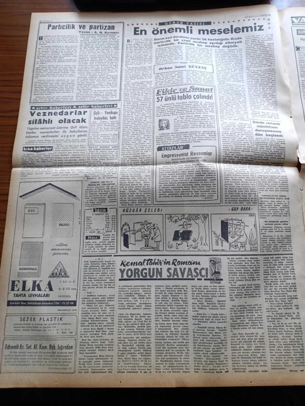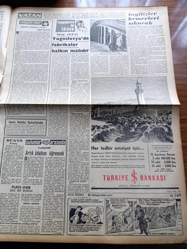 Vatan Gazetesi - 27 Temmuz 1961 - ikinci Tarihi Mektup Yazan Profesör Doktor Yavuz Abadan Köşe Yazısı - Amerika Silahlı Kuvvetler Mevcudunu Arttırıyor - Ragıp Gümüşpala Mektubunu Gönderdi - Vali Refik Tulga Halkın Yardımını İstiyor - Çarşaflılardan Hamallardan Ve Başıboş Çocukların Velilerinden 25 Lira Ceza Alınacak - Fatin Rüştü Zorlu'da 10 Yılda Bir Servet Yaratmış - İş Kanunu Tadil Tasarısı Başbakanlık'ta - Kemal Tahir'in Romanı Yorgun Savaşçı Yazı Dizisi - Veznedarlar Silahlı Olacak - 57 Ünlü Tablo Çalındı - Şişli Yenikapı Troleybüs Hattı - Empresyonist Ressamlar - Yugoslavya'da 15 Gün Yazan Oktay Akbal Köşe Yazısı - Kral Zogo Ve Arnavutluk Kraliçesi Jeraldin'in Hatıraları Yazan Nizameddin Nazif Tepedenlioğlu Yazı Dizisi - Üçüncü Dünya Savaşı Mı - Tonton Agah Çizgi Roman Sade Yalçın - Stiv Roper Çizen Saundes ve Overgard - Cezayir Türküsü Yazan Vecihi Timuroğlu - Yassıada Duruşmaları - Şeref Has Roma'dan Barselona'ya Şükrü Gülesin İle Beraber Gidecek - Antrenör Coşkun Özarı adlı eser, Kitap > Süreli Yayınlar > Gazeteler > Türkiye > Genel > Günlük kategorisinde İkinci El olarak satıştadır.