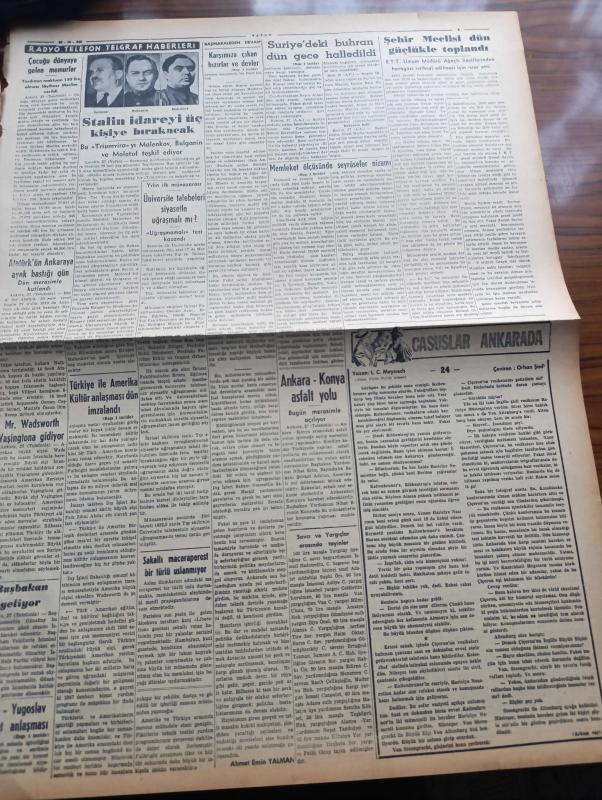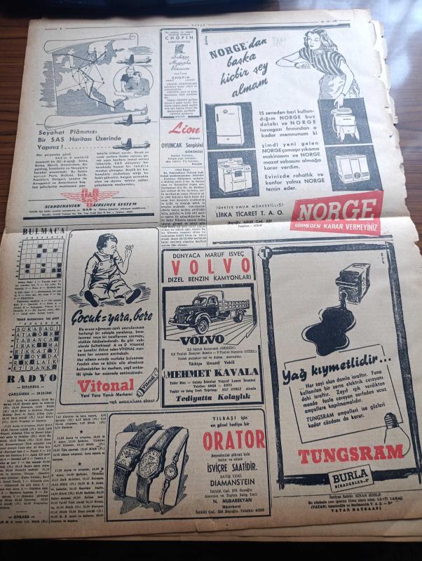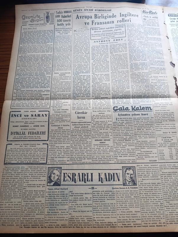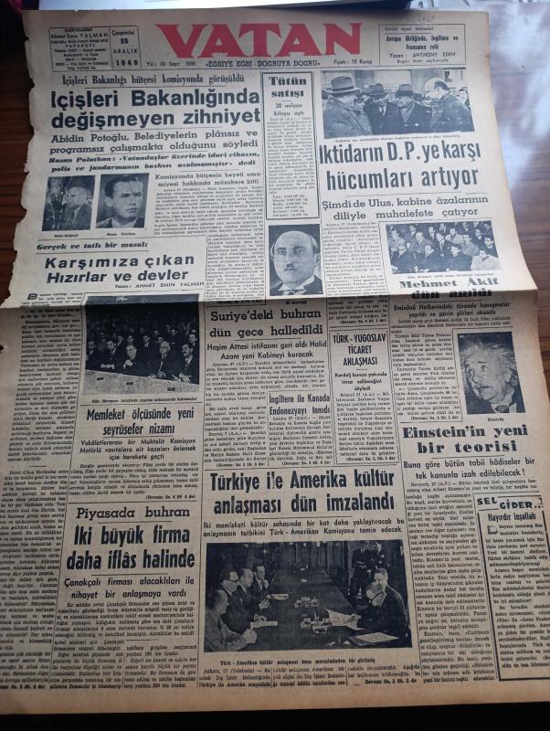 Vatan Gazetesi - 28 Aralık 1949 - Karşımıza Çıkan Hızırlar ve Devler Yazan Ahmet Emin Yalman Köşe Yazısı - İçişleri Bakanlığında Değişmeyen Zihniyet - İktidarın Demokrat Parti'ye Karşı Karşı Hücumları Artıyor - Suriye'de Buhran Dün Gece Halledildi - Haşim Attaşi İstifasını Geri Aldı - Einstein'in Yeni Bir Teorisi - Mehmet Akif Ersoy Dün Anıldı - Türkiye İle Amerikan Kültür Anlaşması Dün İmzalandı - İngiltere Ve Kanada Endonezya'yı Tanıdı - Piyasada Buhran İki Büyük Firma Daha İflas Halinde - Memleket Ölçüsünde Yeni Seyrüsefer Nizamı - Esrarlı Kadın Yazan Alfred Machard Yazı Dizisi - Geçmişte Bugün Yazan Feridun Fazıl Tülbentçi Yazı Dizisi - Avrupa Birliğinde İngiltere Ve Fransa'nın Rolleri Yazan Anthony Eden - Stalin İdareyi Üç Kişiye Bırakacak Molotov Bulganin Ve Malenkov - Casuslar Ankara'da Yazan L.C. Mayzisch Yazı Dizisi - Dünyanın En Modern Tankeri Sovac Astral Bugün Geliyor - Lale Sineması - Melek Sineması - Moskova'dan Geliyorum Yazan Memduh Tezel Yazı Dizisi - Paris'te Tiyatro adlı eser, Kitap > Süreli Yayınlar > Gazeteler > Türkiye > Genel > Günlük kategorisinde İkinci El olarak satıştadır.