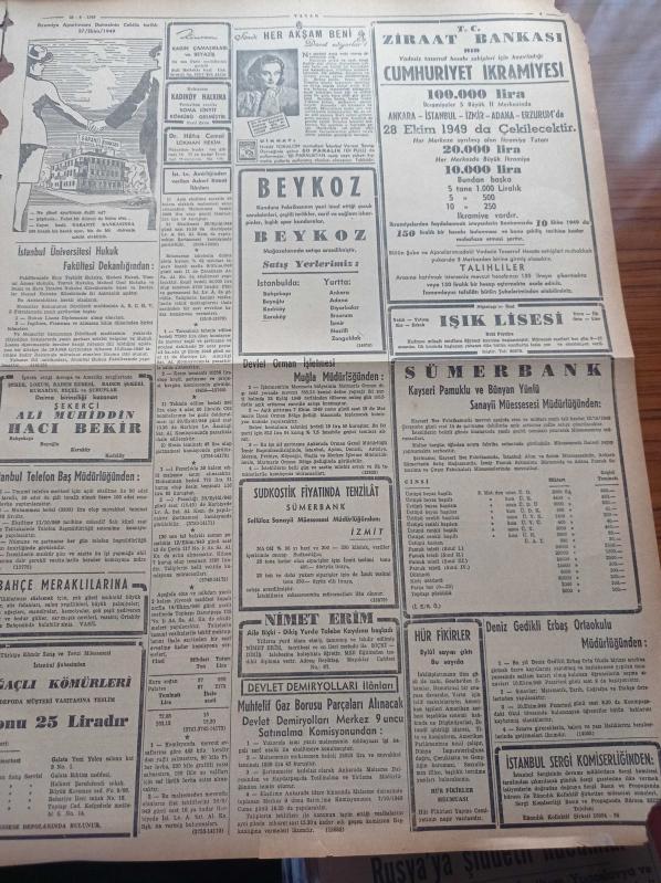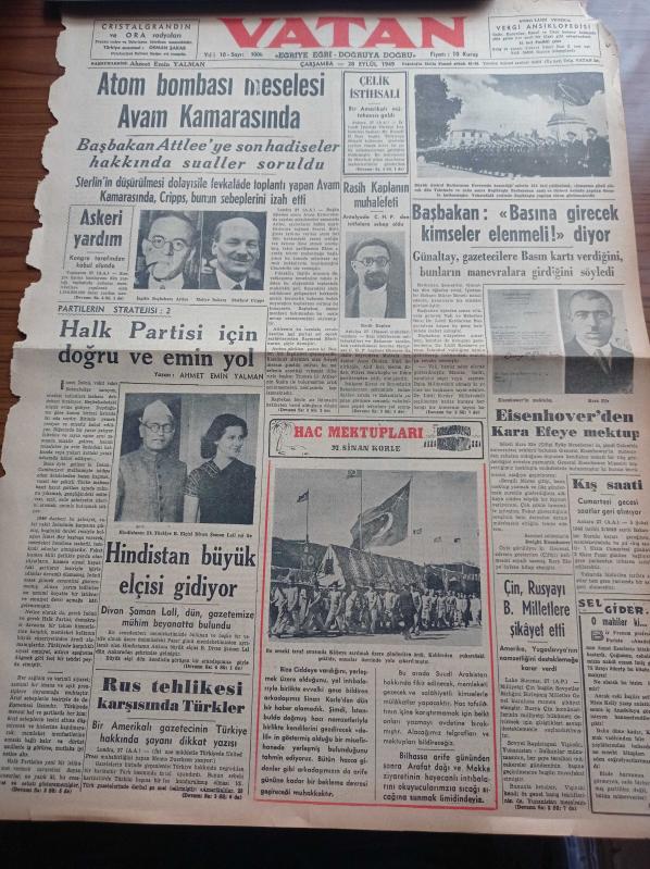 Vatan Gazetesi - 28 Eylül 1949 - Ahmet Emin Yalman - Atom Bombası Meselesi Avam Kamerasında - Eisenhower'den Kara Efeye Mektup - Çin Rusya'yı Birleşmiş Milletlere Şikayet Etti - Hindistan'ın İlk Türk Büyükelçisi Divan Şaman Lall Gidiyor - Sterlin Devalüasyonunun Sebep Ve Neticeleri - Berlin Oteli Yazan Vicki Baum Yazı Dizisi - Beşiktaş Suriye Muhteliti Maçı - Demokrat Parti Balat Ocağının Senelik Kongresi - Mübarek Kurban Bayramı - Ermeni Ruhanileri Arasındaki İhtilaf - Devlet Bakanı Cemil Sait Barlas - Van'da 33 Vatandaşı Kurşuna Dizmekten Mesul Görülenlerin Muhakemesine Bugün De Devam Edilmiştir - Şekerci Ali Muhiddin Hacı Bekir - Beykoz Kundura Fabrikası - Sümerbank - Sheaffers'in Yeni Touch Down Dolma Kalemi - Good Year - Lili Yumakları - Ronson Çakmak - Radyolin Diş Macunu adlı eser Türkçe dilindedir.
