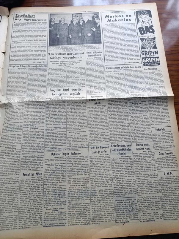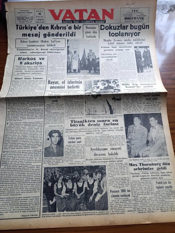 Vatan Gazetesi - 28 Eylül 1954 - Markos Ve Makarios Yazan Ahmet Emin Yalman Köşe Yazısı - Türkiye'de Kıbrıs'a Bir Mesaj Gönderildi - Celal Bayar El İşlerinin Önemini Belirtti - Dokuzlar Bugün Toplanıyor - Milli Tıp Kongresi İzmir'de Açıldı - Canlı Hayvan İhracına İzin Verildi - Titanik'ten Sonra En Büyük Deniz Faciası - Amerikalı İktisatçı Max Thornburg Dün İstanbul'a Geldi - Milli Tıp Kongresi İzmir'de Açıldı - Bu Toprak Uyanacaktır Yazan Muzaffer Buyrukçu Yazı Dizisi - Küçük Sahnede Hamlet - Şaraplarımıza Talip Var - İngiltere'de Bir Vampir Aranıyor - Hoş Memo Karikatür - Hüzün Veren Komedi Filmi Dümbüllü Tarzan Oynayanlar İsmail Dümbüllü ve Mürvet Sim - Celal Bayar'la Yugoslavya'da Yazan Tunç Yalman Yazı Dizisi - Sinema Tenkidleri - Kleopatra Yazan Emil Ludwig Yazı Dizisi - O Gün Hitler Uyuyordu Yazan Yüzbaşı Lidell Hart Yazı Dizisi - Kader Feneri Yazan Jean Martet Yazı Dizisi - Bölge Yüzme Final Yarışmaları Başladı - İran'ın Basketbol Şampiyonu TAC Geliyor, Ahmet Emin Yalman tarafından kaleme alınmıştır. Vatan Gazetesi - 28 Eylül 1954 - Markos Ve Makarios Yazan Ahmet Emin Yalman Köşe Yazısı - Türkiye'de Kıbrıs'a Bir Mesaj Gönderildi - Celal Bayar El İşlerinin Önemini Belirtti - Dokuzlar Bugün Toplanıyor - Milli Tıp Kongresi İzmir'de Açıldı - Canlı Hayvan İhracına İzin Verildi - Titanik'ten Sonra En Büyük Deniz Faciası - Amerikalı İktisatçı Max Thornburg Dün İstanbul'a Geldi - Milli Tıp Kongresi İzmir'de Açıldı - Bu Toprak Uyanacaktır Yazan Muzaffer Buyrukçu Yazı Dizisi - Küçük Sahnede Hamlet - Şaraplarımıza Talip Var - İngiltere'de Bir Vampir Aranıyor - Hoş Memo Karikatür - Hüzün Veren Komedi Filmi Dümbüllü Tarzan Oynayanlar İsmail Dümbüllü ve Mürvet Sim - Celal Bayar'la Yugoslavya'da Yazan Tunç Yalman Yazı Dizisi - Sinema Tenkidleri - Kleopatra Yazan Emil Ludwig Yazı Dizisi - O Gün Hitler Uyuyordu Yazan Yüzbaşı Lidell Hart Yazı Dizisi - Kader Feneri Yazan Jean Martet Yazı Dizisi - Bölge Yüzme Final Yarışmaları Başladı - İran'ın Basketbol Şampiyonu TAC Geliyor adlı eser Türkçe dilindedir.