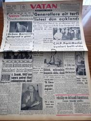 Vatan Gazetesi - 29 Ağustos 1961 - Generallere Ait Terfi Listesi Dün Açıklandı - Korgeneral Muhittin Önür Orgeneral Refik Tulga Korgeneral Oldu - Cumhuriyetçi Köylü Millet Partisi Kongresinde Osman Bölükbaşı Milli Birlik Komitesi Üyesi Fikret Kuytakla Birlikte - Osman Bölükbaşı 1310 Oy Alıp Başkan Oldu - Milli Birlik Komitesinde Yalnız Albay Mucip Ataklı General Olacak - İhsan Soyak 1962'den Sonra Petrol İthal Edilmeyecek Dedi - Ali Fuat Başgil Kasım Gülek'i Takdir Eder Ve Severim Dedi - Mustafa Kemal'in Türkiyesi Yazan Behçet Kemal Çağlar Köşe Yazısı - Uçakla İlk Defa Bugün Şeftali İhraç Edilecek - Galatasaray'ın Sol Beki Ahmet Berman Zina Halinde Yakalandı - Kemal Tahir'in Romanı Yorgun Savaşçı Yazı Dizisi - Birleşmiş Milletler Kuvvetleri Katanga'yı İşgal Etti - Gaziantep Kilis'te Bir Sinemada Panik Çıktı Altı Seyirci Çiğnenip Öldü - Noyan Amca Dert Dinliyor - Fenerbahçeli Nedim Doğan İşi Ucuz Atlatacak - Kasımpaşalı Futbolcu Ali İhsan'a Ait Karar Bugün - 4 Lü Futbol Turnuvası adlı eser, Kitap > Süreli Yayınlar > Gazeteler > Türkiye > Genel > Günlük kategorisinde İkinci El olarak satıştadır.