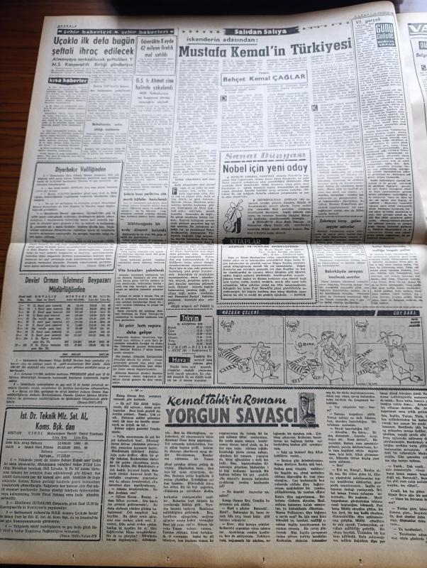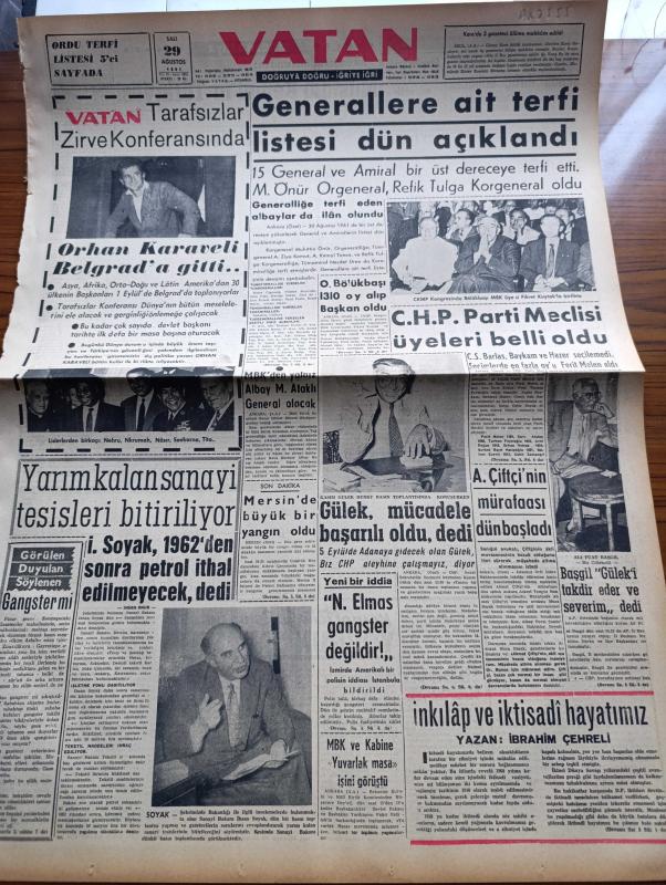 Vatan Gazetesi - 29 Ağustos 1961 - Generallere Ait Terfi Listesi Dün Açıklandı - Korgeneral Muhittin Önür Orgeneral Refik Tulga Korgeneral Oldu - Cumhuriyetçi Köylü Millet Partisi Kongresinde Osman Bölükbaşı Milli Birlik Komitesi Üyesi Fikret Kuytakla Birlikte - Osman Bölükbaşı 1310 Oy Alıp Başkan Oldu - Milli Birlik Komitesinde Yalnız Albay Mucip Ataklı General Olacak - İhsan Soyak 1962'den Sonra Petrol İthal Edilmeyecek Dedi - Ali Fuat Başgil Kasım Gülek'i Takdir Eder Ve Severim Dedi - Mustafa Kemal'in Türkiyesi Yazan Behçet Kemal Çağlar Köşe Yazısı - Uçakla İlk Defa Bugün Şeftali İhraç Edilecek - Galatasaray'ın Sol Beki Ahmet Berman Zina Halinde Yakalandı - Kemal Tahir'in Romanı Yorgun Savaşçı Yazı Dizisi - Birleşmiş Milletler Kuvvetleri Katanga'yı İşgal Etti - Gaziantep Kilis'te Bir Sinemada Panik Çıktı Altı Seyirci Çiğnenip Öldü - Noyan Amca Dert Dinliyor - Fenerbahçeli Nedim Doğan İşi Ucuz Atlatacak - Kasımpaşalı Futbolcu Ali İhsan'a Ait Karar Bugün - 4 Lü Futbol Turnuvası, Ahmet Emin Yalman tarafından kaleme alınmıştır. Vatan Gazetesi - 29 Ağustos 1961 - Generallere Ait Terfi Listesi Dün Açıklandı - Korgeneral Muhittin Önür Orgeneral Refik Tulga Korgeneral Oldu - Cumhuriyetçi Köylü Millet Partisi Kongresinde Osman Bölükbaşı Milli Birlik Komitesi Üyesi Fikret Kuytakla Birlikte - Osman Bölükbaşı 1310 Oy Alıp Başkan Oldu - Milli Birlik Komitesinde Yalnız Albay Mucip Ataklı General Olacak - İhsan Soyak 1962'den Sonra Petrol İthal Edilmeyecek Dedi - Ali Fuat Başgil Kasım Gülek'i Takdir Eder Ve Severim Dedi - Mustafa Kemal'in Türkiyesi Yazan Behçet Kemal Çağlar Köşe Yazısı - Uçakla İlk Defa Bugün Şeftali İhraç Edilecek - Galatasaray'ın Sol Beki Ahmet Berman Zina Halinde Yakalandı - Kemal Tahir'in Romanı Yorgun Savaşçı Yazı Dizisi - Birleşmiş Milletler Kuvvetleri Katanga'yı İşgal Etti - Gaziantep Kilis'te Bir Sinemada Panik Çıktı Altı Seyirci Çiğnenip Öldü - Noyan Amca Dert Dinliyor - Fenerbahçeli Nedim Doğan İşi Ucuz Atlatacak - Kasımpaşalı Futbolcu Ali İhsan'a Ait Karar Bugün - 4 Lü Futbol Turnuvası adlı eser Türkçe dilindedir.