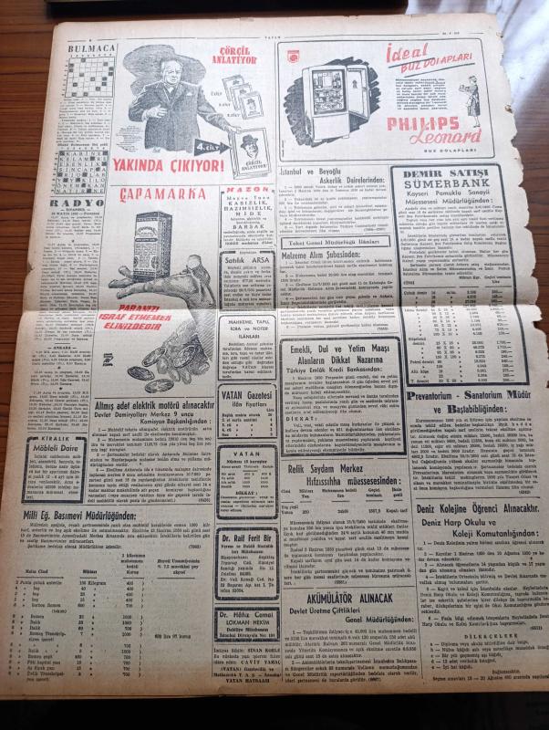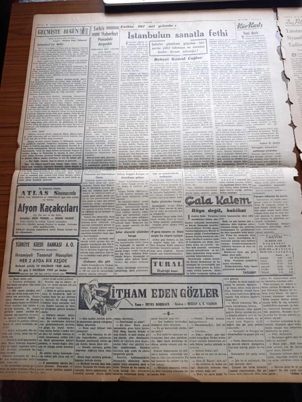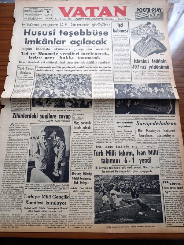 Vatan Gazetesi - 29 Mayıs 1950 - Hükümet Programı Demokrat Parti Grubunda Görüşüldü - Ahmet Emin Yalman Köşe Yazısı - Türk Yunan Dostluğu - Türkiye Milli Gençlik Komitesi Kuruluyor - İşçi Kabinesi - İstanbul Fethinin 497. Yıldönümü - Bursa'da Güvenspor İle İvazpaşa Maçının Sonunda Kanlı Arbede - Türk Milli Takımı İran Milli Takımını 6 1 Yendi - Arnavutluk Seçimleri - Suriye'de Buhran Bir Koalisyon Kabinesi Kurulması Düşünülüyor - İtham Eden Gözler Yazan Henry Bordeaux Yazı Dizisi - İstanbul'un Sanatla Fethi Yazan Behçet Kemal Çağlar - Değerli Bestekar Adnan Saygun Avrupa Ve Amerika'ya Gidiyor - Rusların Doğu'da Kurduğu Kızıl Alman Ordusu - Resimlerle Hadiseler - Kudüs'te Mukaddes Bir Makam - Ürdün Kralı Abdullah Futbolcularımızı Kabul Etti - Kanuni Sultan Süleyman Yazan Feridun Fazıl Tülbentçi Yazı Dizisi - Philips Leonard Buzdolabı - Çapamarka-İstanbul Ankara Radyosu Programı - Mazon Mevya Tuzu - Doktor Raif Ferit Bir -Birleşmiş Milletler Adalet Komisyonu Türk Delegesi Abdullah Polat adlı eser, Kitap > Süreli Yayınlar > Gazeteler > Türkiye > Genel > Günlük kategorisinde İkinci El olarak satıştadır.