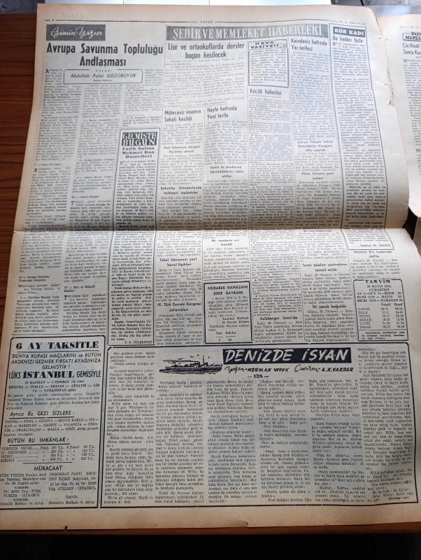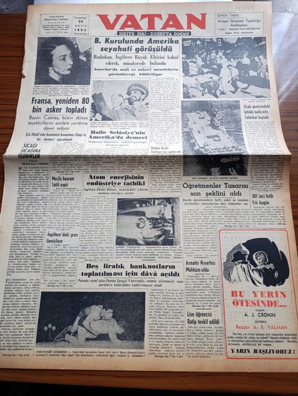 Vatan Gazetesi - 29 Mayıs 1954 - Bakanlar Kurulunda Amerikan Seyahati Görüşüldü - Başbakan Adnan Menderes İngiltere Büyükelçisini Kabul Ederek Müzakerede Bulundu - Habeşistan İmparatoru Haile Selasiye'nin Amerika'da Demeci - Çin Hindinde Komünist Komutanı Giap'ın Bir Demeci Yayınlandı - Ahmet Emin Yalman Köşe Yazısı - Fransa Yeniden 80 Bin Asker Topladı - Atom Enerjisinin Endüstriye Tatbiki - Beş Liralık Banknotların Toplatılması İçin Dava Açıldı - Denizde İsyan Yazan Herman Wouk Yazı Dizisi - Kız Talebisini İğfal Eden İmam Hilmi Toroş'un Sakalı Kesildi - Avrupa Savunma Topluluğu Andlaşması Yazan Abdullah Pulat Gözübüyük - General Ali Fuat Cebesoy'un Siyasi Hatıraları Yazı Dizisi - Kukla Tiyatroları - Everest Fatihi Edmund Hillary Zatürreye Tutulmuş - Jigolo Yazan Daniel Harper Yazı Dizisi - Tokyo'da Yapılan Dünya Serbest Güreş Şampiyonası'ndan Resimler - Türkiye İkinci Güzeli Ayfer Feray Puro Tuvalet Sabunu Kullanıyorum Diyor - Fenerbahçe Amatörleri Beyoğluspor'u 4 1 Yendi - Radyo adlı eser, Kitap > Süreli Yayınlar > Gazeteler > Türkiye > Genel > Günlük kategorisinde İkinci El olarak satıştadır.