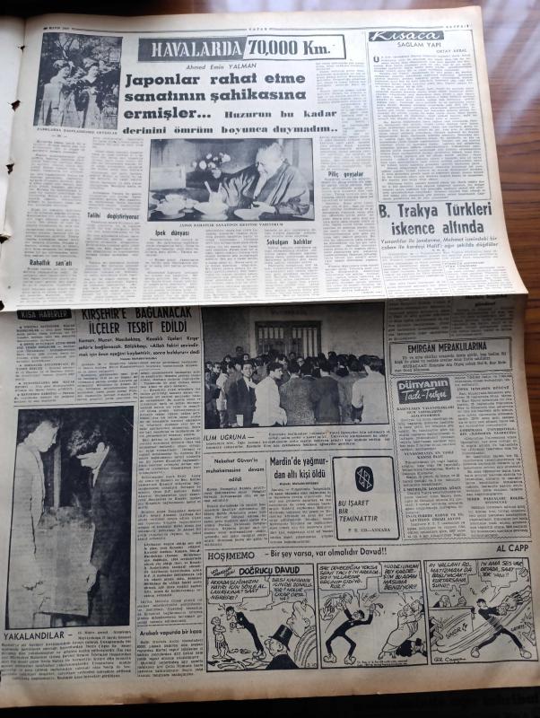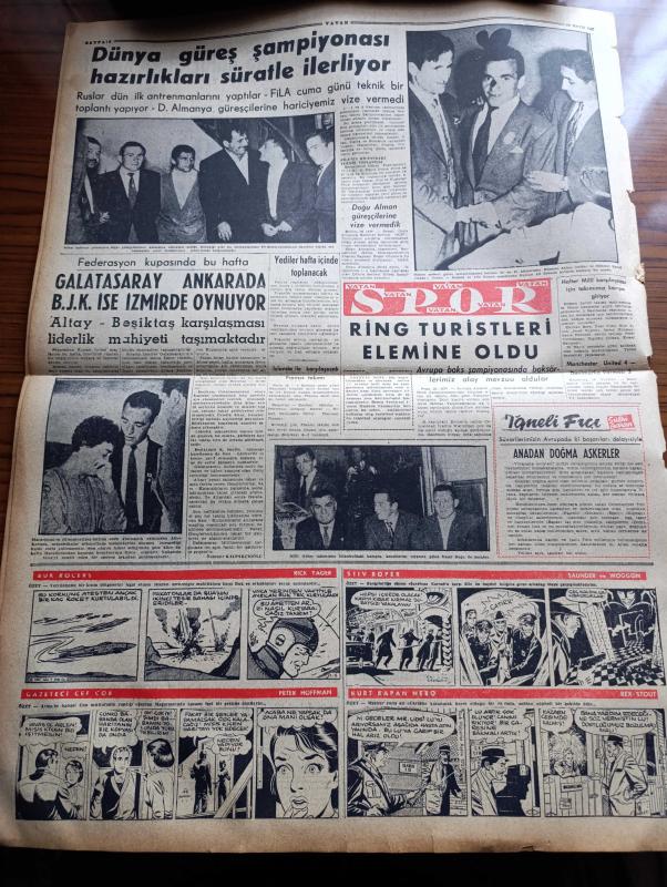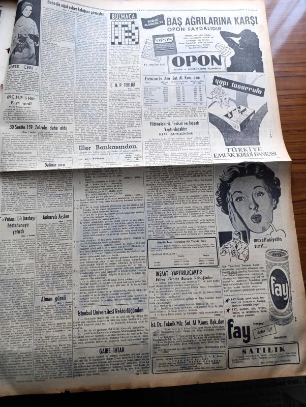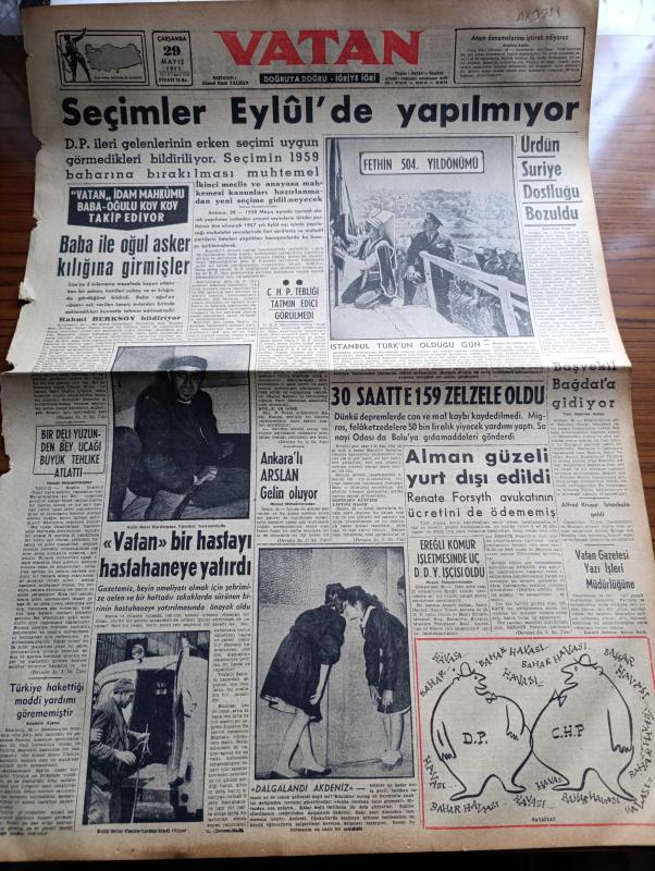 Vatan Gazetesi - 29 Mayıs 1957 - Seçimler Eylül'de Yapılmıyor - Vatan Gazetesi İdam Mahkumu Baba Oğulu Köy Köy Takip Ediyor- Fethin 504. Yıldönümü - Alman Güzeli Renate Forsyth Yurtdışı Edildi - Ürdün Suriye Dostluğu Bozuldu - Kandilli Rasathanesi - 30 Saatte 159 Zelzele Oldu - Afrika'da Fransız Siyaseti Yazan John Gunther Yazı Dizisi - Eflatun Kız Yazan Nihal Yeğinobalı Yazı Dizisi - Fatih Ve Şiir Yazan Ahmet Kutsi Tecer - Dünya Güreş Şampiyonası İçin Özel PTT Damgası - Kırşehir'e Bağlanacak İlçeler Tesbit Edildi - Batı Trakya Türkleri İşkence Altında - Charlie Chaplin Yine Çocuk İstiyor - Batakhane İnsanları Yazan Adnan Veli - 1001 Gece Masalları Hazırlayan Suat Taşer Yazı Dizisi - Burç Falı - Fay Temizleme Tozu - Opon Ağrı Kesici - Bulmaca - Dünya Güreş Şampiyonası Hazırlıkları Süratle İlerliyor - Federasyon Kupasında Bu Hafta Galatasaray Ankara'da Beşiktaş İse İzmir'de Oynuyor - Buk Rocers Çizen Rick Yager - Stiv Roper Çizen Saunder Ve Woggon - Gazeteci Cef Cob Çizen Peter Hoffman adlı eser, Kitap > Süreli Yayınlar > Gazeteler > Türkiye > Genel > Günlük kategorisinde İkinci El olarak satıştadır.