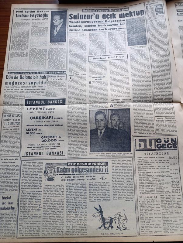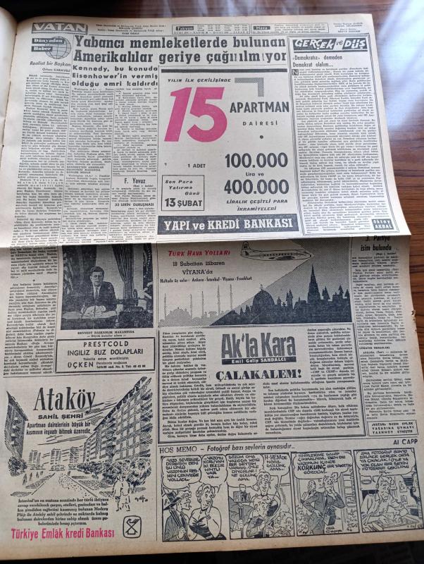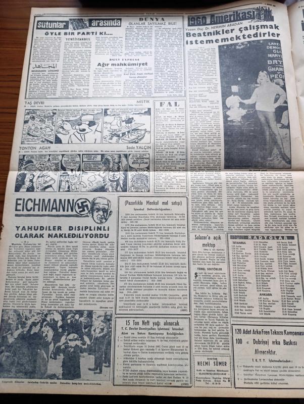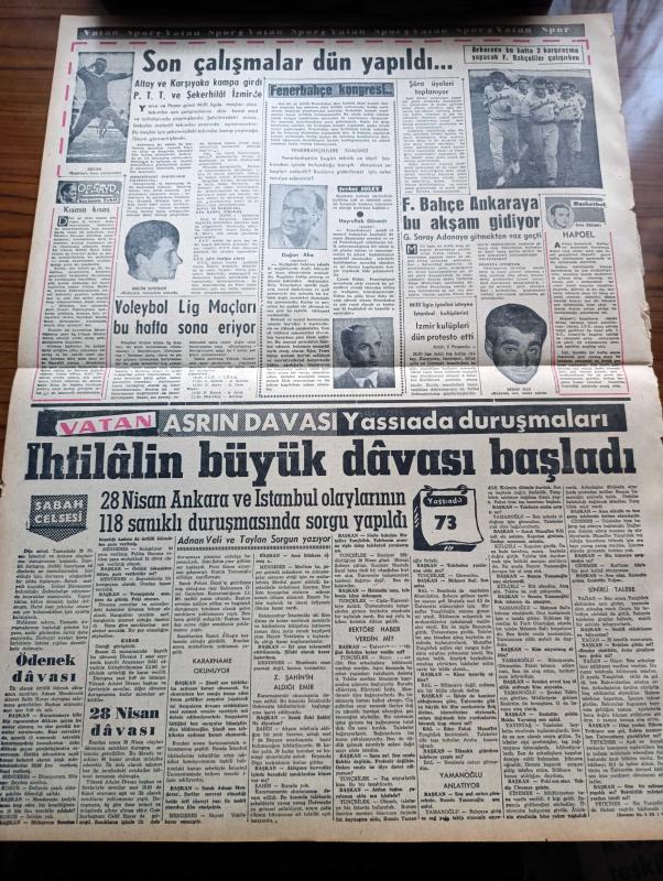 Vatan Gazetesi - 3 Şubat 1961 - Anayasayı Çiğneyen Gençliğe Ateş Açan 118 Sanık Adalet Önünde - İhtilalin Büyük Davası Başladı - Bumin Yamanoğlu Sürüklediği Öğrenciyi Sivil Polis Sanmış - İmar Bakanı Fehmi Yavuz Dün İstifa Etti - 3. Parti'ye İsim Bulundu Yeni Türkiye Partisi - 1500 Maden İşçisinin İşine Son Verildi - Balık Akını Devam Ediyor - Milli Eğitim Bakanı Turhan Feyzioğlu - İhtilalci Yüzbaşı Galvao'dan Salazar'a Açık Mektup - Aziz Nesin'in Romanı Kağnı Gölgesindeki İt Yazı Dizisi - Yabancı Memleketlerde Bulunan Amerikalılar Geriye Çağırılmıyor - Oktay Akbal Köşe Yazısı - Emil Galip Sandalcı Köşe Yazısı - Eichmann Yahudiler Disiplinli Olarak Naklediliyordu - Taş Devri Çizen Mıstık - Tonton Agah Çizgi Roman Sade Yalçın - 1960 Amerikası Yazan Doçent Doktor Nermin Abadan Yazı Dizisi - Asrın Davası Yassıada Duruşmaları - Fenerbahçeliler Kongresi - Şeref Has Kadroda Var Fakat Sakat - Voleybol Lig Maçları Bu Hafta Sona Eriyor - Zeki Şahin'in Aldığı Emir - Ödenek Davası - Milli Lig adlı eser, Kitap > Süreli Yayınlar > Gazeteler > Türkiye > Genel > Günlük kategorisinde İkinci El olarak satıştadır.