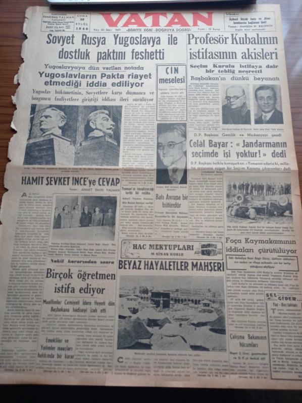 Vatan Gazetesi - 30 Eylül 1949 - Sovyet Rusya Yugoslavya İle Dostluk Paktını Feshetti - Stalin Tito İhtilafını Canlandıran Sembolik Bir Resim - Profesör Naili Kubalı'nın İstifasının Akisleri - Celal Bayar Jandarmanın Seçimde İşi Yoktur - Hamit Şevket İnce'ye Cevap - Truman'ın İmzalayacağı Tarihi Bir Vesika - Hac Mektupları Yazı Dizisi - Berlin Oteli Yazan Vicki Baum Yazı Dizisi - Yeni Amerikan Başkonsolosu La Verne Baldwin- Cumhurbaşkanı İsmet İnönü Yakup Kadri Karaosmanoğlu'nu Kabul Etti - 3. Büyük Harp ve Atom Bombasına Bağlanan Ümit - Ses Tiyatrosu - Yıldız Sineması - Ankara'da Yapılan Atletizm Müsabakaları - Brasso Maden Cilası - Arı Pirinç Unu - Şehir Dram Tiyatrosunda Faust Sahneye Koyan Muhsin Ertuğrul - Sümerbank - Vasfi Rıza Zobu, Ahmet Emin Yalman tarafından kaleme alınmıştır. Vatan Gazetesi - 30 Eylül 1949 - Sovyet Rusya Yugoslavya İle Dostluk Paktını Feshetti - Stalin Tito İhtilafını Canlandıran Sembolik Bir Resim - Profesör Naili Kubalı'nın İstifasının Akisleri - Celal Bayar Jandarmanın Seçimde İşi Yoktur - Hamit Şevket İnce'ye Cevap - Truman'ın İmzalayacağı Tarihi Bir Vesika - Hac Mektupları Yazı Dizisi - Berlin Oteli Yazan Vicki Baum Yazı Dizisi - Yeni Amerikan Başkonsolosu La Verne Baldwin- Cumhurbaşkanı İsmet İnönü Yakup Kadri Karaosmanoğlu'nu Kabul Etti - 3. Büyük Harp ve Atom Bombasına Bağlanan Ümit - Ses Tiyatrosu - Yıldız Sineması - Ankara'da Yapılan Atletizm Müsabakaları - Brasso Maden Cilası - Arı Pirinç Unu - Şehir Dram Tiyatrosunda Faust Sahneye Koyan Muhsin Ertuğrul - Sümerbank - Vasfi Rıza Zobu adlı eser Türkçe dilindedir.