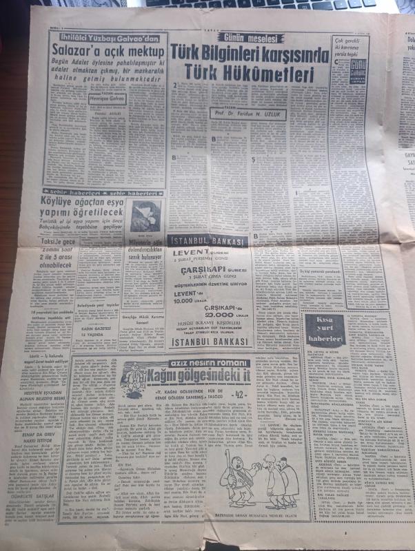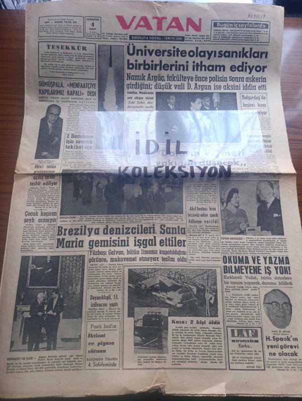 Vatan Gazetesi - 4 Şubat 1961 - Üniversite Olayları Hürriyet Savaşıdır Dedi - Doların Kıymeti Yakında Düşecek - Ragıp Gümüşpala Menfaatçiye Kapılarımız Kapalı Dedi - Brezilya Denizcileri Santa Maria Gemisini İşgal Ettiler - Okuma Yazma Bilmeyene İş Yok - Bulgurdağ'da Beşinci Kuyu Petrol Veriyor - İhtilalci Yüzbaşı Galvao'dan Salazar'a Açık Mektup - Aziz Nesin'in Romanı Kağnı Gölgesindeki İt Yazı Dizisi - Asrın Davası Yassıada Duruşmaları - Galatasaray Kıbrıs'a Bugün Gidiyor - Fenerbahçe Gençlerbirliği Maçı - Beşiktaş Karagümrük Maçı - Spor Toto'nun Bu Hafta Hasılatı - Altay Şekerhilal Maçı - Mehmet Dayanıklıgil 13. İzdivacını yaptı - Amerikan başkanı Kennedy ve Şair Robert Frost Fotoğrafı - H. Spaak'ın yeni görevi ne olacak - takside gece zammı saat 2 ile 5 arası alınabilecek - Lastik iş kolunda asgari ücret tespit ediliyor - esnaf da grev Hakkı istiyor - Akhisar'da bir gecede 46 köpek öldürüldü - nurculuğa ait kitap bulundu - Kurumlar vergisi hakkında odaları birliği'nin görüşü t, Ahmet Emin Yalman tarafından kaleme alınmıştır. Vatan Gazetesi - 4 Şubat 1961 - Üniversite Olayları Hürriyet Savaşıdır Dedi - Doların Kıymeti Yakında Düşecek - Ragıp Gümüşpala Menfaatçiye Kapılarımız Kapalı Dedi - Brezilya Denizcileri Santa Maria Gemisini İşgal Ettiler - Okuma Yazma Bilmeyene İş Yok - Bulgurdağ'da Beşinci Kuyu Petrol Veriyor - İhtilalci Yüzbaşı Galvao'dan Salazar'a Açık Mektup - Aziz Nesin'in Romanı Kağnı Gölgesindeki İt Yazı Dizisi - Asrın Davası Yassıada Duruşmaları - Galatasaray Kıbrıs'a Bugün Gidiyor - Fenerbahçe Gençlerbirliği Maçı - Beşiktaş Karagümrük Maçı - Spor Toto'nun Bu Hafta Hasılatı - Altay Şekerhilal Maçı - Mehmet Dayanıklıgil 13. İzdivacını yaptı - Amerikan başkanı Kennedy ve Şair Robert Frost Fotoğrafı - H. Spaak'ın yeni görevi ne olacak - takside gece zammı saat 2 ile 5 arası alınabilecek - Lastik iş kolunda asgari ücret tespit ediliyor - esnaf da grev Hakkı istiyor - Akhisar'da bir gecede 46 köpek öldürüldü - nurculuğa ait kitap bulundu - Kurumlar vergisi hakkında odaları birliği'nin görüşü t adlı eser Türkçe dilindedir.