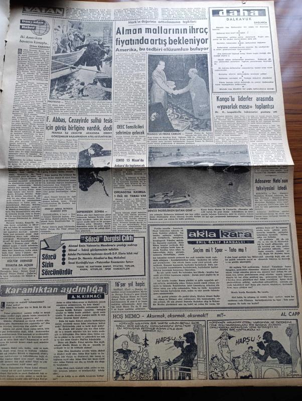 Vatan Gazetesi - 6 Mart 1961 - Kraliçe Elizabeth Bugün Türkiye'ye Geliyor - Yeni Türkiye Partisi 23 İlde Teşkilat Kuruyor - Tanınmış Sinema Yıldızı Elizabeth Taylor'un Hastalığı Devam Ediyor - Öğretmen İhtiyacı 10 Yılda Karşılanacak - Arkeoloji Nazariyesi Değişti - Amerika'da 5,5 Milyon İşsiz Var - Aziz Nesin'in Romanı Kağnı Gölgesindeki İt Yazı Dizisi - D'Hont Sistemi Mi Briand Sistemi Mi Yazan Abdurrahman Konuk - Avrupa İktisadi İşbirliği Teşkilatı OEEC İstanbul'a Gelecek - Emil Galip Sandalcı Köşe Yazısı - Ömer Seyfettin'i Anış Yazan Tarık Binat - Kongo'nun Esrarlı Adamı Gizenga - Taş Devri Çizen Mıstık - Stiv Roper Çizen Saunders Ve Overgard - Tonton Agah Çizgi Roman Sade Yalçın - Polis Kordonu Altında Oynanan Maç Fenerbahçe 3 Gençlerbirliği 3 - Adana Demirspor Takımı İstanbulspor'u 2 1 Yendi - Spor Toto Neticeleri - Şeker Hilal 2 Demirspor 0 - Karşıyaka 6 Göztepe 2 - Dolapdere'de Arap Nasri'nin Rakibi Küçük Cafer Öldürüldü - Orucun Faydaları Yazan Doktor Süheyl Ünver, Ahmet Emin Yalman tarafından kaleme alınmıştır. Vatan Gazetesi - 6 Mart 1961 - Kraliçe Elizabeth Bugün Türkiye'ye Geliyor - Yeni Türkiye Partisi 23 İlde Teşkilat Kuruyor - Tanınmış Sinema Yıldızı Elizabeth Taylor'un Hastalığı Devam Ediyor - Öğretmen İhtiyacı 10 Yılda Karşılanacak - Arkeoloji Nazariyesi Değişti - Amerika'da 5,5 Milyon İşsiz Var - Aziz Nesin'in Romanı Kağnı Gölgesindeki İt Yazı Dizisi - D'Hont Sistemi Mi Briand Sistemi Mi Yazan Abdurrahman Konuk - Avrupa İktisadi İşbirliği Teşkilatı OEEC İstanbul'a Gelecek - Emil Galip Sandalcı Köşe Yazısı - Ömer Seyfettin'i Anış Yazan Tarık Binat - Kongo'nun Esrarlı Adamı Gizenga - Taş Devri Çizen Mıstık - Stiv Roper Çizen Saunders Ve Overgard - Tonton Agah Çizgi Roman Sade Yalçın - Polis Kordonu Altında Oynanan Maç Fenerbahçe 3 Gençlerbirliği 3 - Adana Demirspor Takımı İstanbulspor'u 2 1 Yendi - Spor Toto Neticeleri - Şeker Hilal 2 Demirspor 0 - Karşıyaka 6 Göztepe 2 - Dolapdere'de Arap Nasri'nin Rakibi Küçük Cafer Öldürüldü - Orucun Faydaları Yazan Doktor Süheyl Ünver adlı eser Türkçe dilindedir.