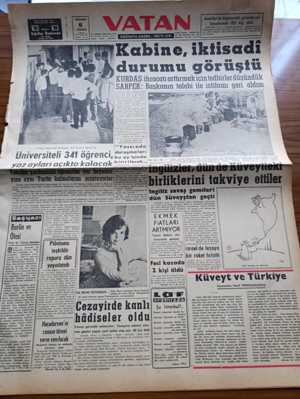 Vatan Gazetesi - 6 Temmuz 1961 - Kabine İktisadi Durumu Görüştü - Maliye Bakanı Kemal Kurdaş İhracatı Arttırmak İçin Tedbirler Düşündük - Selim Sarper Başkanın Talebi İle İstifamı Geri Aldım - Yassıada Duruşmaları Bu Ay İçinde Bitirilecek - Bayan Kennedy'nin İlk Resmi Fotoğrafı - Gregoryen Ermenilerin Ruhani Lideri Vasken Haçaduryan'ın Cenazesi İçin İstanbul'a Geldi - İngilizler Dün De Kuveytteki Birliklerini Takviye Ettiler - İsrail De Fezaya Bir Roket Fırlattı - Kemal Tahir'in Romanı Yorgun Savaşçı Yazı Dizisi - Bulgar Ajanı Yusuf Hocaoğlu'nun Asker Kaçağı Olduğu Anlaşıldı - Rasputinin Sonu Sahnede - Rüzgar Çelebi Çizen Guy Bara - Fidel Castro'nun Kardeşi Frau Castro Bir Suikastte Yaralandı - Cezayir'de Müslümanlar Evlerinden Çıkmıyorlar - Berlin Film Festivali Sonuçlandı - Kruşçev Amerikan Bağımsızlık Günü Balosuna Katıldı - Berlin Film Festivalinde - Metin Oktay Veda Beyanatı Verdi - Balkan Güreş Müsabakalarına Katılmıyoruz - Beşiktaş Gençlerle Temasını Hızlandırdı - At Yarışları adlı eser, Kitap > Süreli Yayınlar > Gazeteler > Türkiye > Genel > Günlük kategorisinde İkinci El olarak satıştadır.