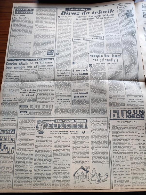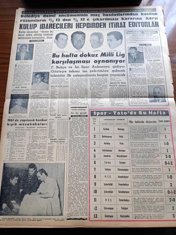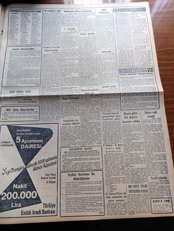 Vatan Gazetesi - 7 Şubat 1961 - Turhan Feyzioğlu Milli Eğitim Bakanlığından İstifa Etti - Rüştü Özal Dün İmar Bakanı Oldu - Sosyalist Partisi Başkanı Şükrü Bıçakçı İle Genel Sekreteri Alaeddin Tiritlioğlu Beraat Etti - Devrim Aleyhine Teşkilat Kurmak İsteyen 9 Kişi Daha Yakalandı - Petrol Sondajlarımız Çok Müsbet Sonuçlar Veriyor - Kanarya Sergisi - Rusya'nın Türkiye'deki Roket Üsleri İle İlgili Bir Teşebbüsü - Aziz Nesin'in Romanı Kağnı Gölgesindeki İt Yazı Dizisi - Trafik Kontrolüne Belediye Zabıtası Da Katılacak - Geleceğin Alperenlerini Yetiştirecek Kurullardan Biri De Teknik Akademi Yazan Behçet Kemal Çağlar - Kıbrıs'ta Bakan Andreas Papadopulos İşsizler Tarafından Dün Tartaklandı - Kübalılar Amerikan Üssüne Su Temin Eden Şirkete El Koydular - Amerika'nın Yabancı Üsler Politikasının Esasları - Piyanist Raffi Petrossian - Belediyenin Maç Yazılarından Keseceği %35'lik Paya Kulüp İdarecileri Hepbirden İtiraz Ediyorlar - Hakkı Yeten - Fenerbahçe Kongresi - Spor Toto'da Bu Hafta, Ahmet Emin Yalman tarafından kaleme alınmıştır. Vatan Gazetesi - 7 Şubat 1961 - Turhan Feyzioğlu Milli Eğitim Bakanlığından İstifa Etti - Rüştü Özal Dün İmar Bakanı Oldu - Sosyalist Partisi Başkanı Şükrü Bıçakçı İle Genel Sekreteri Alaeddin Tiritlioğlu Beraat Etti - Devrim Aleyhine Teşkilat Kurmak İsteyen 9 Kişi Daha Yakalandı - Petrol Sondajlarımız Çok Müsbet Sonuçlar Veriyor - Kanarya Sergisi - Rusya'nın Türkiye'deki Roket Üsleri İle İlgili Bir Teşebbüsü - Aziz Nesin'in Romanı Kağnı Gölgesindeki İt Yazı Dizisi - Trafik Kontrolüne Belediye Zabıtası Da Katılacak - Geleceğin Alperenlerini Yetiştirecek Kurullardan Biri De Teknik Akademi Yazan Behçet Kemal Çağlar - Kıbrıs'ta Bakan Andreas Papadopulos İşsizler Tarafından Dün Tartaklandı - Kübalılar Amerikan Üssüne Su Temin Eden Şirkete El Koydular - Amerika'nın Yabancı Üsler Politikasının Esasları - Piyanist Raffi Petrossian - Belediyenin Maç Yazılarından Keseceği %35'lik Paya Kulüp İdarecileri Hepbirden İtiraz Ediyorlar - Hakkı Yeten - Fenerbahçe Kongresi - Spor Toto'da Bu Hafta adlı eser Türkçe dilindedir.
