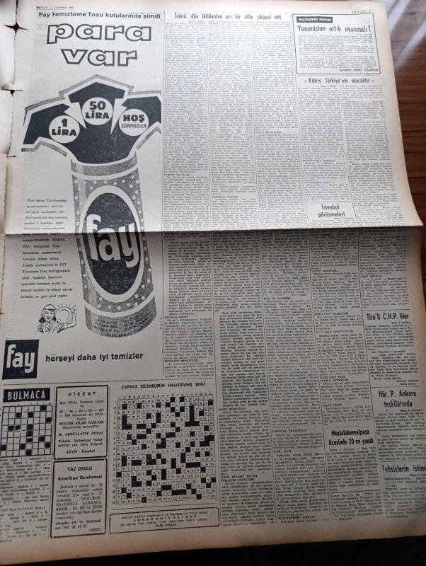 Vatan Gazetesi - 7 Temmuz 1958 - Yunanistan Artık Uyanmalı Yazan Ahmet Emin Yalman Köşe Yazısı - İsmet İnönü Dün İktidardan Acı Bir Dille Şikayet Etti - Bağdat Paktı İle Alakalı Olarak Geniş Çapta Temaslar Yapılıyor - Cumhurbaşkanı Celal Bayar Umurbey'e Gitti - Kıbrıs Türkiye'nin Olacaktır Bu Bir Tabiat Kanunudur - Lefkoşe'de Örfi İdare İlan Edildi - Yandan Akıyor Yandan Adnan Veli'nin Yeni Romanı Yazı Dizisi - Taş Devri Çizen Mıstık - Çakaralmaz Hafiye Çizen Eflatun Nuri - Atom Konferansı İkinci Safhada - Gina Lollobrigida'yı Gina Yapan Adam Kocası Mirko - Şu Ölüm Denilen Şey Yazan Frederic Dard Yazı Dizisi - Burç Falı - 3,5 Yürekli Şerif Çizen OCKS - Rüzgar Çelebi Çizen Guy Bara - Stiv Roper Çizen Saunder Ve Waggon - İstanbul'da Sinemalar Tiyatrolar Programı - Fay Temizleme Tozu - Fenerbahçe'de İktidarı Tarafsızlar Aldı - Osman Kavrakoğlu Raif Dinçkök Firuzan Tekil Ve Faruk Ilgaz Yeni İdare Heyetine Girdiler - Transfer - Zeki Rıza Sporel Fotoğraf - Müslim Bağcılar Konuşuyor, Ahmet Emin Yalman tarafından kaleme alınmıştır. Vatan Gazetesi - 7 Temmuz 1958 - Yunanistan Artık Uyanmalı Yazan Ahmet Emin Yalman Köşe Yazısı - İsmet İnönü Dün İktidardan Acı Bir Dille Şikayet Etti - Bağdat Paktı İle Alakalı Olarak Geniş Çapta Temaslar Yapılıyor - Cumhurbaşkanı Celal Bayar Umurbey'e Gitti - Kıbrıs Türkiye'nin Olacaktır Bu Bir Tabiat Kanunudur - Lefkoşe'de Örfi İdare İlan Edildi - Yandan Akıyor Yandan Adnan Veli'nin Yeni Romanı Yazı Dizisi - Taş Devri Çizen Mıstık - Çakaralmaz Hafiye Çizen Eflatun Nuri - Atom Konferansı İkinci Safhada - Gina Lollobrigida'yı Gina Yapan Adam Kocası Mirko - Şu Ölüm Denilen Şey Yazan Frederic Dard Yazı Dizisi - Burç Falı - 3,5 Yürekli Şerif Çizen OCKS - Rüzgar Çelebi Çizen Guy Bara - Stiv Roper Çizen Saunder Ve Waggon - İstanbul'da Sinemalar Tiyatrolar Programı - Fay Temizleme Tozu - Fenerbahçe'de İktidarı Tarafsızlar Aldı - Osman Kavrakoğlu Raif Dinçkök Firuzan Tekil Ve Faruk Ilgaz Yeni İdare Heyetine Girdiler - Transfer - Zeki Rıza Sporel Fotoğraf - Müslim Bağcılar Konuşuyor adlı eser Türkçe dilindedir.