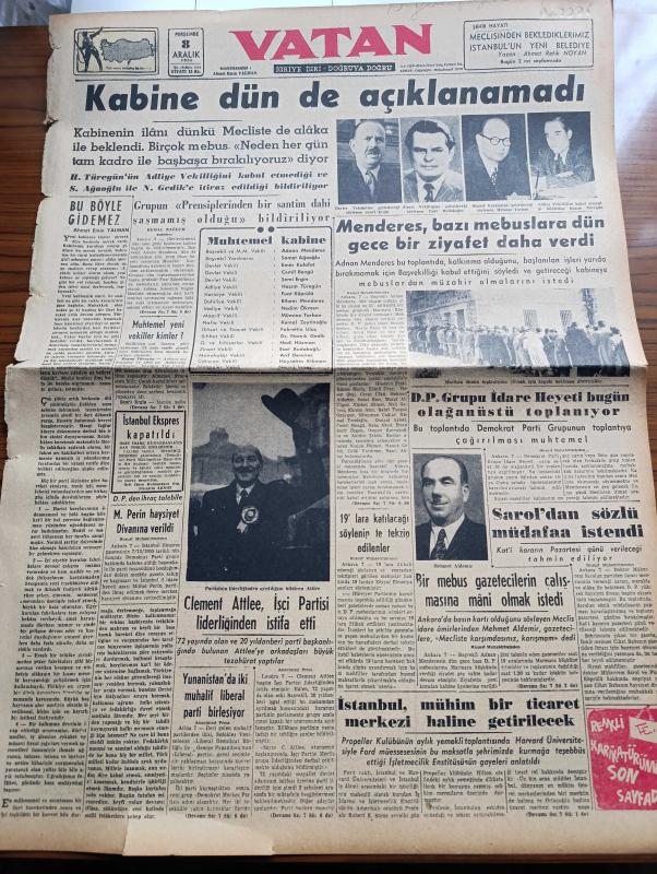 Vatan Gazetesi - 8 Aralık 1955 - Ahmet Emin Yalman Köşe Yazısı - Kabine Dün De Açıklanamadı - Muhtemel Yeni Vekiller Kimler - Clement Attle İşçi Partisi Liderliğinden İstifa Etti - Adnan Menderes Bazı Mebuslara Dün Gece Bir Ziyafet Daha Verdi - Demokrat Parti Grubu İdare Heyeti Bugün Olağanüstü Toplanıyor - Mükerrem Sarol'dan Sözlü Müdafaa İstendi - İstanbul Mühim Bir Ticaret Merkezi Haline Getirilecek - Fırtınalı Gece Yazan Orhan Kemal Yazı Dizisi - Yılbaşı Gecesi İçin Bir Masa 1000 Lira - Eyüp Bölgesinde 1,5 Ayda 140 Tifo Vakası - Geçmişte Bugün Güzel Kraliçe Mari Stuart Yazan Feridun Fazıl Tülbentçi Yazı Dizisi - Gazeteci Ceyn Arden'in Maceraları Çizgi Roman - Hoş Memo Karikatür - Hürriyet Partisinin Tüzüğü Hazırlandı - İslam Tarihinde Düşünen Baş Hazreti Ali Yazan Abdülbaki Gölpınarlı Yazı Dizisi - Moda İlkokulundan Yavrularla Bir Sohbet - Çocuk Köşesi - Cemiyet Hayatı - Radyo Ve Bulmaca - Opon Ağrı Kesici - Milli Piyango Dün Çekildi - Spor Oyunları Federasyonunun Son Aldığı Karar, Ahmet Emin Yalman tarafından kaleme alınmıştır. Vatan Gazetesi - 8 Aralık 1955 - Ahmet Emin Yalman Köşe Yazısı - Kabine Dün De Açıklanamadı - Muhtemel Yeni Vekiller Kimler - Clement Attle İşçi Partisi Liderliğinden İstifa Etti - Adnan Menderes Bazı Mebuslara Dün Gece Bir Ziyafet Daha Verdi - Demokrat Parti Grubu İdare Heyeti Bugün Olağanüstü Toplanıyor - Mükerrem Sarol'dan Sözlü Müdafaa İstendi - İstanbul Mühim Bir Ticaret Merkezi Haline Getirilecek - Fırtınalı Gece Yazan Orhan Kemal Yazı Dizisi - Yılbaşı Gecesi İçin Bir Masa 1000 Lira - Eyüp Bölgesinde 1,5 Ayda 140 Tifo Vakası - Geçmişte Bugün Güzel Kraliçe Mari Stuart Yazan Feridun Fazıl Tülbentçi Yazı Dizisi - Gazeteci Ceyn Arden'in Maceraları Çizgi Roman - Hoş Memo Karikatür - Hürriyet Partisinin Tüzüğü Hazırlandı - İslam Tarihinde Düşünen Baş Hazreti Ali Yazan Abdülbaki Gölpınarlı Yazı Dizisi - Moda İlkokulundan Yavrularla Bir Sohbet - Çocuk Köşesi - Cemiyet Hayatı - Radyo Ve Bulmaca - Opon Ağrı Kesici - Milli Piyango Dün Çekildi - Spor Oyunları Federasyonunun Son Aldığı Karar adlı eser Türkçe dilindedir.