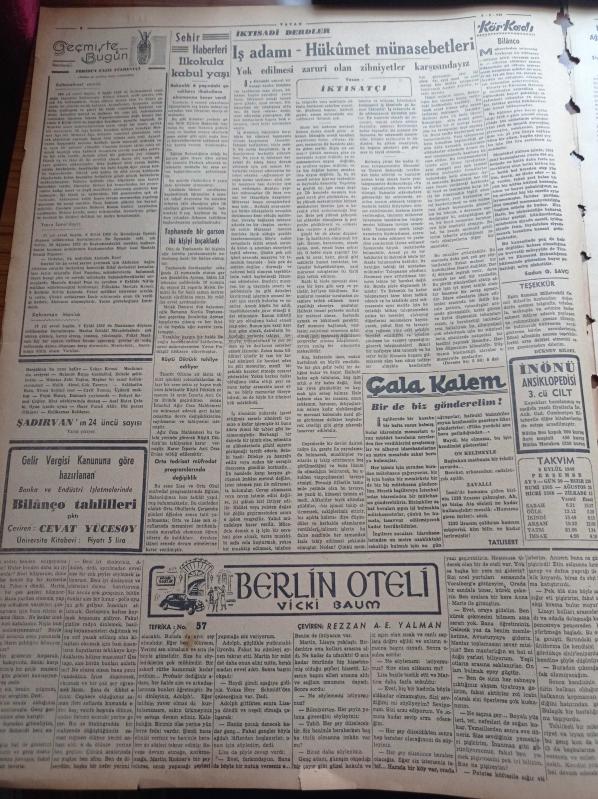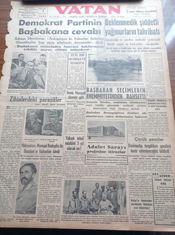 Vatan Gazetesi - 8 Eylül 1949 - Demokrat Parti'nin Başbakan Şemsettin Günaltay'a Cevabı - Adnan Menderes - Celal Bayar - Yeni Bir Senirkent Hadisesi - İsmet İnönü Mareşal Fevzi Çakmak'ı Ziyarete Gitti - Lütfi Kırdar - Adalet Sarayı Projesine İtiraz - Habeşistan Mareşal Badoglio İle Graziani'yi İtalya'dan İstedi - Berlin Oteli Yazan Vicki Baum Yazı Dizisi - Rüştü Diktürk Tahliye Edildi - Feridun Fazıl Tülbentçi - Bernard Shaw - İkinci Büyük Hidroelektrik Tesisatı - Nuh'un Gemisi Ağrı'da Değil Cudi Dağı'ndaymış - Hitler Rusya'yı İstilaya Nasıl Karar Vermişti - Mussolini- Dentol Antiseptik Diş Macunu - Derman Ağrı Kesici - Hasan Kolonyası Losyonları Parfümleri - Droja Briyantini - Seiberling Kamyon Lastikleri - Şişli Terakki Lisesi - Devakin, Ahmet Emin Yalman tarafından kaleme alınmıştır. Vatan Gazetesi - 8 Eylül 1949 - Demokrat Parti'nin Başbakan Şemsettin Günaltay'a Cevabı - Adnan Menderes - Celal Bayar - Yeni Bir Senirkent Hadisesi - İsmet İnönü Mareşal Fevzi Çakmak'ı Ziyarete Gitti - Lütfi Kırdar - Adalet Sarayı Projesine İtiraz - Habeşistan Mareşal Badoglio İle Graziani'yi İtalya'dan İstedi - Berlin Oteli Yazan Vicki Baum Yazı Dizisi - Rüştü Diktürk Tahliye Edildi - Feridun Fazıl Tülbentçi - Bernard Shaw - İkinci Büyük Hidroelektrik Tesisatı - Nuh'un Gemisi Ağrı'da Değil Cudi Dağı'ndaymış - Hitler Rusya'yı İstilaya Nasıl Karar Vermişti - Mussolini- Dentol Antiseptik Diş Macunu - Derman Ağrı Kesici - Hasan Kolonyası Losyonları Parfümleri - Droja Briyantini - Seiberling Kamyon Lastikleri - Şişli Terakki Lisesi - Devakin adlı eser Türkçe dilindedir.