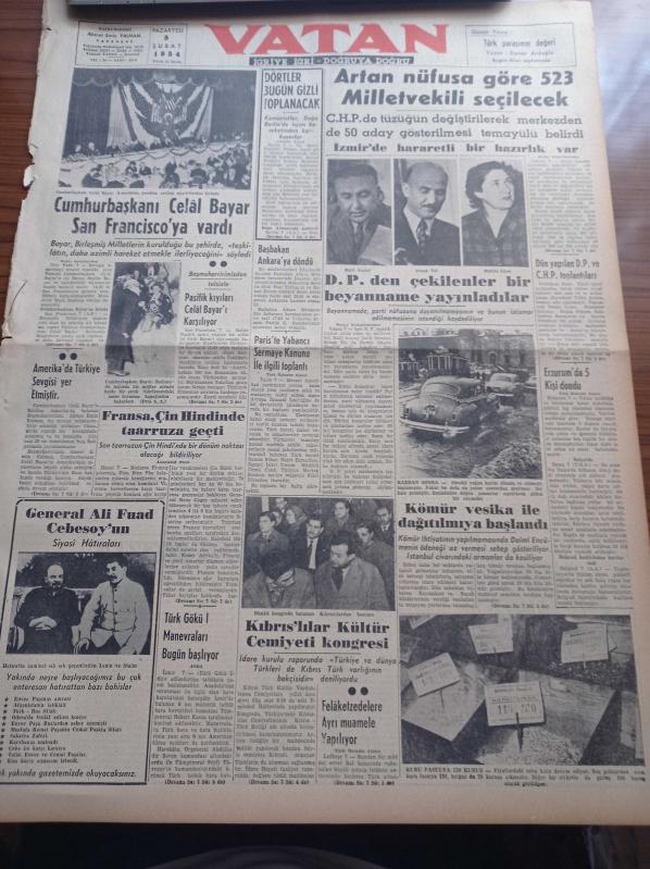 Vatan Gazetesi - 8 Şubat 1954 - Ahmet Emin Yalman - Cumhurbaşkanı Celal Bayar San Francisco'ya Vardı -Ahmet Emin Yalman - Artan Nüfusa Göre 523 Milletvekili Seçilecek - Demokrat Parti'den Çekilenler Bir Beyanname Yayınladılar - Dörtler Bugün Gizli Toplanacak - Başbakan Adnan Menderes Ankara'ya Döndü - Amerika'da Türkiye Sevgisi Yer Etmiştir - Türk Gökü 1 Manevraları Bugün Başlıyor - Artan Nüfusa Göre 523 Milletvekili Seçilecek - Kömür Vesika İle Dağıtılmaya Başlandı - Kıbrıs'lılar Kültür Cemiyeti Kongresi - Asma Köprü Ve Metro İçin Çalışmalar - Türk Parasının Değeri - Hidrojen Bombasının Tecrübe Hazırlıkları - Hamdi Helvacı Yılmadan Çalışmak İstiyor - Cem Kurt Çizen Bedri Koraman - Albert Camus Veba Romanı Yazı Dizisi - İntihar Eden Mucid H. Armstrong - Cemiyet Hayatı - Tiyatrolar - Cibali Karakolu- İstanbulspor İle Adalet Berabere Kaldılar - Avustralya Ve 1956 Olimpiyat Oyunları - Basketbol Maçları - Sümerbank - Köhler Dikiş Makinası - Çapamarka - Kodak - Dermojen - Lion Mağazası adlı eser Türkçe dilindedir.