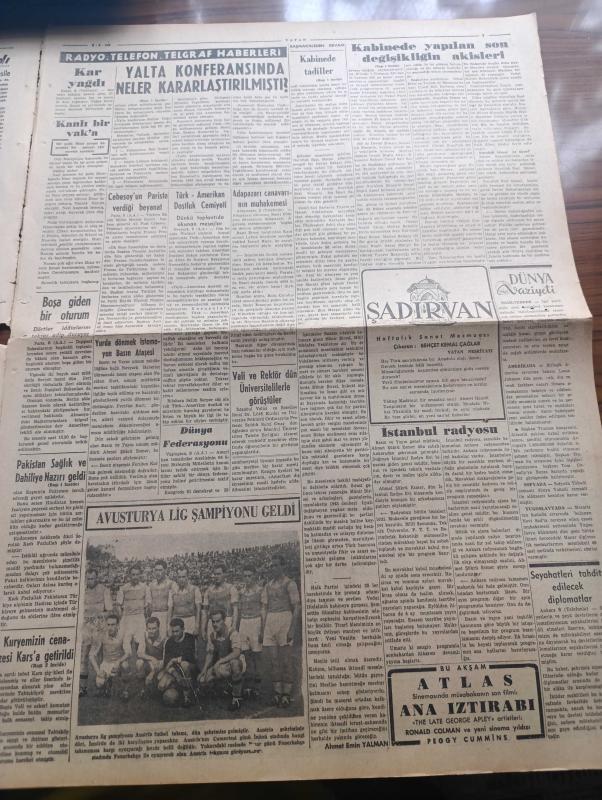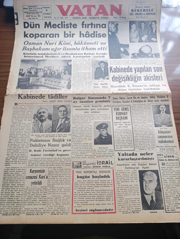 Vatan Gazetesi - 9 Haziran 1949 - Kabinede Tadiller Yazan Ahmet Emin Yalman Köşe Yazısı - Dün Mecliste Fırtına Koparan Bir Hadise - Osman Nuri Köni Hükümeti Ve Başbakanı Ağır Lisanla İtham Etti - Pakistan Sağlık Ve Dahiliye Nazırı Kadı Fazlullah Geldi - Sovyetlere Hayatını Kaybeden Kuryemiz Fuat Güzaltan'ın Cenazesi Kars'a Getirildi - Bulgar Limanında 7 Ay Tutulan Handan İsimli Gemimiz - Adapazarı Canavarı Basri Ersoyun Muhakemesi - Osmanoğulları Yazan Feridun Fazıl Tülbentçi Yazı Dizisi - Mısırlı Güreşçiler Dün Gitti - Avusturya Lig Şampiyonu Austria Takımı Geldi - Queens Park Rangers Galatasaray Bugün Karşılaşıyor - Bugünkü İsrail Yazan Sinan Korle Yazı Dizisi - Fakir Ve Yetim Çocuklara Yardım Eşya Piyangosu - Bulmaca - İstanbul Radyosu Programı - Mavi Gillette Traş Bıçağı - Hanomag Ziraat Traktörleri - İsveç Malı Volvo Kamyon - Zeiss Marka Mikroskop - K L M Hollanda Kraliyet Havayolları - Tarlan Diş Macunu, Ahmet Emin Yalman tarafından kaleme alınmıştır. Vatan Gazetesi - 9 Haziran 1949 - Kabinede Tadiller Yazan Ahmet Emin Yalman Köşe Yazısı - Dün Mecliste Fırtına Koparan Bir Hadise - Osman Nuri Köni Hükümeti Ve Başbakanı Ağır Lisanla İtham Etti - Pakistan Sağlık Ve Dahiliye Nazırı Kadı Fazlullah Geldi - Sovyetlere Hayatını Kaybeden Kuryemiz Fuat Güzaltan'ın Cenazesi Kars'a Getirildi - Bulgar Limanında 7 Ay Tutulan Handan İsimli Gemimiz - Adapazarı Canavarı Basri Ersoyun Muhakemesi - Osmanoğulları Yazan Feridun Fazıl Tülbentçi Yazı Dizisi - Mısırlı Güreşçiler Dün Gitti - Avusturya Lig Şampiyonu Austria Takımı Geldi - Queens Park Rangers Galatasaray Bugün Karşılaşıyor - Bugünkü İsrail Yazan Sinan Korle Yazı Dizisi - Fakir Ve Yetim Çocuklara Yardım Eşya Piyangosu - Bulmaca - İstanbul Radyosu Programı - Mavi Gillette Traş Bıçağı - Hanomag Ziraat Traktörleri - İsveç Malı Volvo Kamyon - Zeiss Marka Mikroskop - K L M Hollanda Kraliyet Havayolları - Tarlan Diş Macunu adlı eser Türkçe dilindedir.