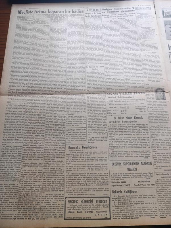 Vatan Gazetesi - 9 Haziran 1949 - Kabinede Tadiller Yazan Ahmet Emin Yalman Köşe Yazısı - Dün Mecliste Fırtına Koparan Bir Hadise - Osman Nuri Köni Hükümeti Ve Başbakanı Ağır Lisanla İtham Etti - Pakistan Sağlık Ve Dahiliye Nazırı Kadı Fazlullah Geldi - Sovyetlere Hayatını Kaybeden Kuryemiz Fuat Güzaltan'ın Cenazesi Kars'a Getirildi - Bulgar Limanında 7 Ay Tutulan Handan İsimli Gemimiz - Adapazarı Canavarı Basri Ersoyun Muhakemesi - Osmanoğulları Yazan Feridun Fazıl Tülbentçi Yazı Dizisi - Mısırlı Güreşçiler Dün Gitti - Avusturya Lig Şampiyonu Austria Takımı Geldi - Queens Park Rangers Galatasaray Bugün Karşılaşıyor - Bugünkü İsrail Yazan Sinan Korle Yazı Dizisi - Fakir Ve Yetim Çocuklara Yardım Eşya Piyangosu - Bulmaca - İstanbul Radyosu Programı - Mavi Gillette Traş Bıçağı - Hanomag Ziraat Traktörleri - İsveç Malı Volvo Kamyon - Zeiss Marka Mikroskop - K L M Hollanda Kraliyet Havayolları - Tarlan Diş Macunu adlı eser, Kitap > Süreli Yayınlar > Gazeteler > Türkiye > Genel > Günlük kategorisinde İkinci El olarak satıştadır.