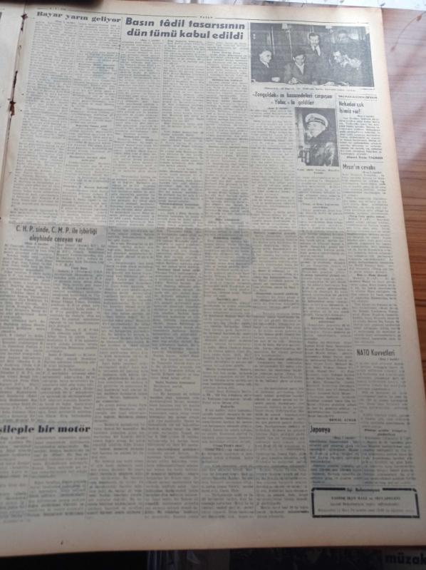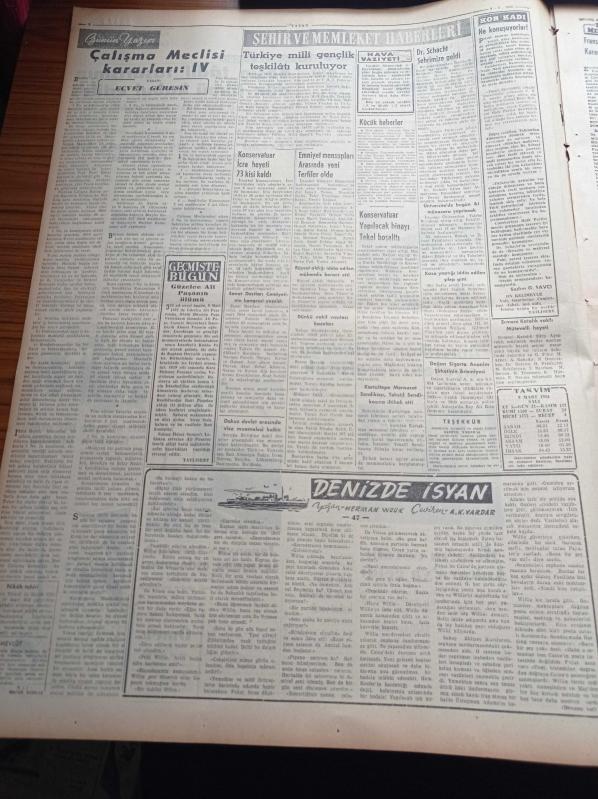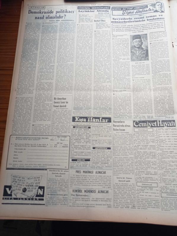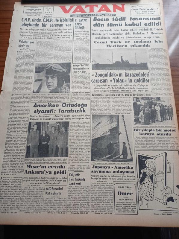 Vatan Gazetesi - 9 Mart 1954 - Cumhuriyet Halk Partisinde Cumhuriyetçi Millet Partisi Aleyhinde Bir Cereyan Var - Celal Bayar Yarın Geliyor - Amerikan Ortadoğu Siyaseti Tarafsızlık - Basın Tadil Tasarısının Dün Tümü Kabul Edildi - Japonya Amerika Savunma Anlaşması - Zonguldak'ın Kazazedeleri Çarpışan Yolaç'la Geldiler - Güzelce Ali Paşa'nın Ölümü - Denizde İsyan Yazan Herman Wouk Yazı Dizisi - Türkiye Milli Gençlik Teşkilatı Kuruluyor - Sanat Dostları Cemiyetinin Kongresi Yapıldı - Adem Havva Oldu İsminde Bir Film Çevriliyor - Muallimler Cemiyetinin 36. Yıldönümü - General Ali Fuat Cebesoy'un Siyasi Hatıraları Yazı Dizisi - Bekir Sami Bey - Burhan Arpad Sinema Tenkidleri - Sabahattin Kudret Aksal Gazoz Ağacı - Scala Buz Revüsünde Uçuşan Kızlar- 15 Günlük Lig Maçları Programı - Köhler Dikiş Makinası adlı eser, Kitap > Süreli Yayınlar > Gazeteler > Türkiye > Genel > Günlük kategorisinde İkinci El olarak satıştadır.