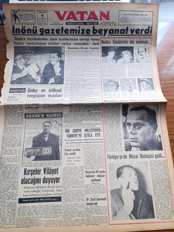 Vatan Gazetesi - 9 Mart 1957 - Ahmet Emin Yalman Köşe Yazısı - İsmet İnönü Gazetemize Beyanat Verdi - Ruslara Komünistler Bile İnanmıyor - Macarlara Bütün Dünya Kucağını Açtı - Suriye Milletvekili Abdül Hadibe Maharani Türkiye'ye İltica Etti - Kırşehir'in Macerası Yazan Erol Ülgen - Pearl Harbor Baskınının Anlatılmayan Tarafları Yazan Walter Lord Yazı Dizisi - Amerikalı Ermeni Koleksiyoncu Arcutter Kazancian İstanbul'da - Ahmet Mithat Efendi'nin Bir Romanı Musullu Süleyman Sadeleştiren Behçet Necatigil Yazı Dizisi - İlahi Komedya Ve Peer Gynt - NATO Kuvvetleri Başkumandanı General Norstad Türkiye NATO Ve Bağdat Paktı Arasında Bir Kilit Noktasıdır - Irak Prensi Abdulillah Bugün Gidiyor - Çanakkale Türk'ün Kahramanlık Destanı Yazan Alan Moorehead Yazı Dizisi - Reşat Nuri Güntekin İçin Yazan Ruşen Eşref Ünaydın Yazı Dizisi - 1001 Gece Masalları Hazırlayan Suat Taşer Yazı Dizisi - Ev Kadın Moda - Burç Falı - Macar Ujpeşt Takımı Kafile Başkanı Sebes İzmir Futbolunu İlerlemiş Gördüm Dedi adlı eser, Kitap > Süreli Yayınlar > Gazeteler > Türkiye > Genel > Günlük kategorisinde İkinci El olarak satıştadır.