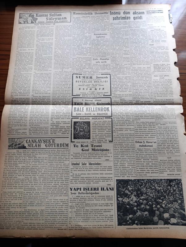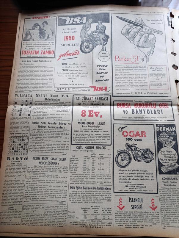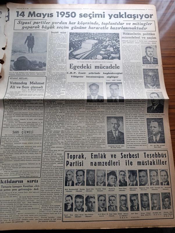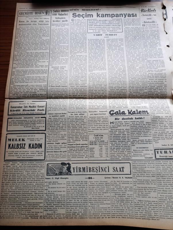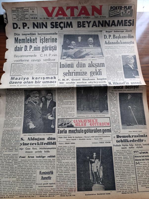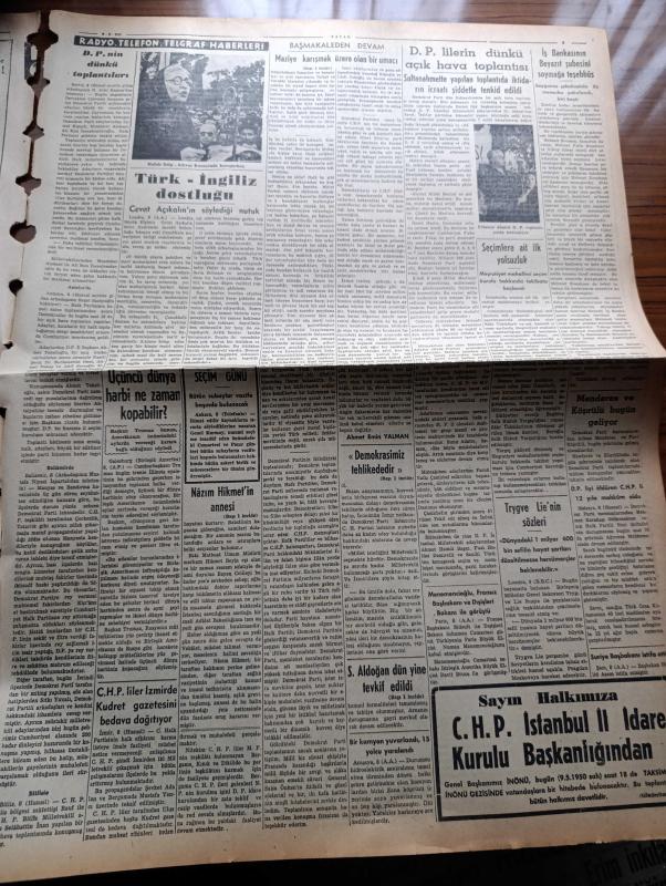 Vatan Gazetesi - 9 Mayıs 1950 - Maziye Karışmak Üzere Olan Bir Umacı Yazan Ahmet Emin Yalman Köşe Yazısı İşsizlik - Demokrat Parti'nin Seçim Beyannamesi - İsmet İnönü Dün Akşam Şehrimize Geldi - Demokrat Parti Başkanı Celal Bayar Dün Ankara'da Konuştu - Sadık Aldoğan Dün Yine Tevkif Edildi - Fuat Arna Tahliye Edildi - Erzurum Gençlik Teşekküllerinin Beyannamesi Komünistlik Beyannamesi - Nazım Hikmet'in Annesi Ölüm Orucuna Başlıyor Fotoğraf - Halide Edip Adıvar İzmir'de Seçim Nutku Söyledi - Yirmibeşinci Saat Yazan C. Virgil Gheorghui Yazı Dizisi - 19 Mayıs Gençlik Bayramı - Helikopterin Tecrübesi Yapıldı - 14 Mayıs 1950 Seçimi Yaklaşıyor - Amerikalılar Beşiktaş Takımını Bekliyor - Radarla Çizilen Beyin Ve Kalbin Haritaları - Hikaye Bir Hesap Makinesi Yazan Michelle Maurois - Parker 51 Kalem - Üçüncü Dünya Harbi Ne Zaman Kopabilir - İstanbul Ankara Radyosu Programı - Kanuni Sultan Süleyman Yazan Feridun Fazıl Tülbentçi Yazı Dizisi - Taksim Belediye Gazinosunda Bale Kellenrok adlı eser, Kitap > Süreli Yayınlar > Gazeteler > Türkiye > Genel > Günlük kategorisinde İkinci El olarak satıştadır.