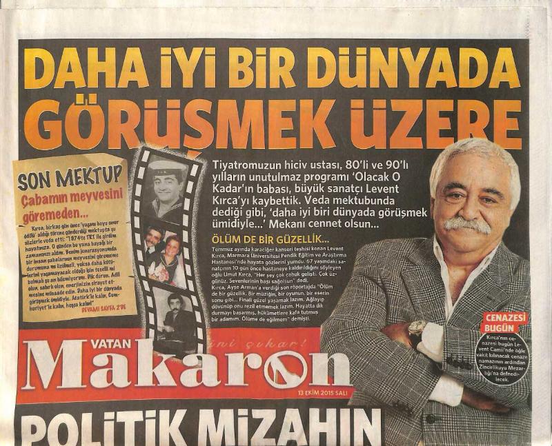 Vatan Gazetesi Makaron Eki 13 Ekim 2015 - Büyük Sanatçı Levent Kırca'yı Kaybettik - 50 Cent'in İstanbul Konseri GZ154740, en son 19 gün önce güncellenmiştir.