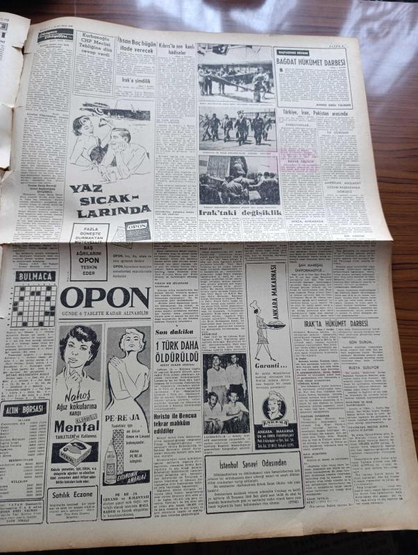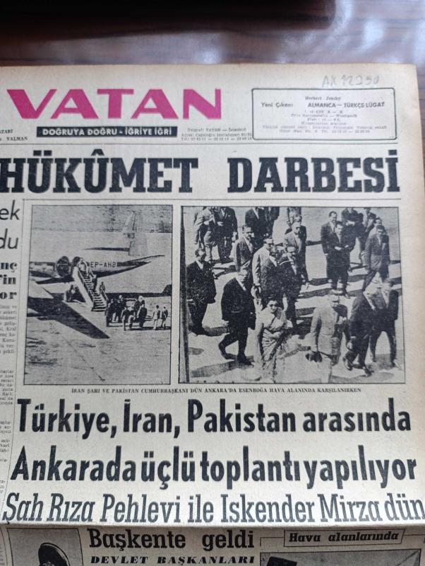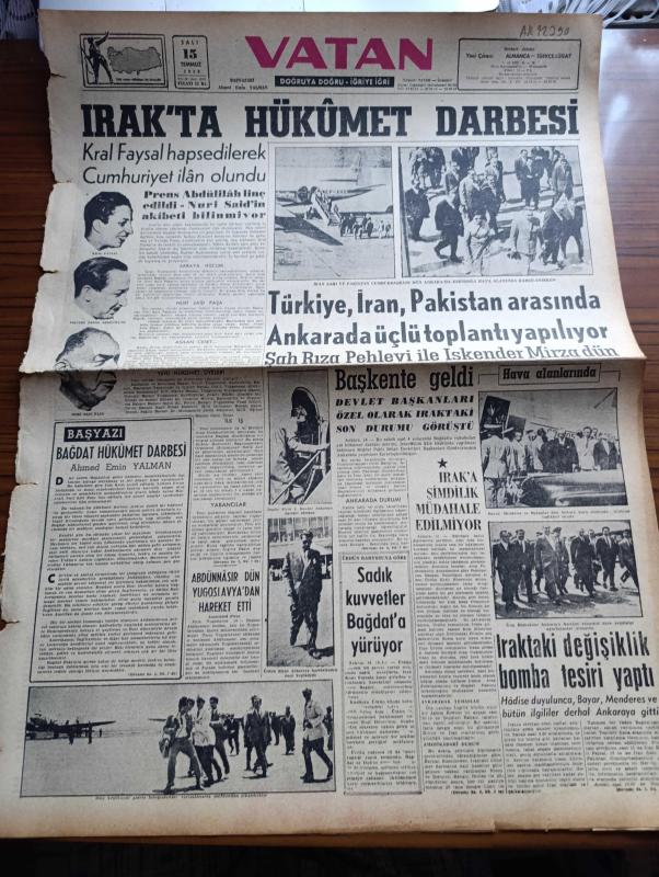Vatan Gazetesi - Turkish Newspaper - 15 Temmuz 1958 - Bağdat hükümet darbesi yazan Ahmet Emin Yalman Başmakale - Irak'ta hükümet darbesi - Kral Faysal hapsedilerek cumhuriyet ilan olundu - Prens abdülilah linç edildi - Nuri Sait Paşa'nın akıbeti bilinmiyor - İran şahı ve Pakistan Cumhurbaşkanı Dün Ankarada Esenboğa havaalanında karşılanırken fotoğraf - Türkiye İran Pakistan arasında Ankara'da üçlü toplantı yapılıyor - Şah Rıza Pehlevi ile İskender Mirza dün Başkente geldi - Celal Bayar Adnan Menderes ve Bakanlar dün Ankara havaalanında uçaktan indikleri sırada fotoğraf - Irak'a şimdilik müdahale edilmiyor - Ürdün radyosuna göre Sadık kuvvetler bağdat'a yürüyor - yandan akıyor yandan yazan Adnan Veli Yazı Dizisi - kıbrıs'taki kanlı hadiseler üzerine İngiltere'ye dün sert bir nota verdik - Hacılar Tarsus vapurunu kirletti - Dansöz Gönül mahkemede hakim kararıyla soyundu - salyangoz bile yazan Emil Galip Sandalcı - burç falınız - Kadri Aytaç'ın durumu fotoğraf, Ahmet Emin Yalman tarafından kaleme alınmıştır. Vatan Gazetesi - Turkish Newspaper - 15 Temmuz 1958 - Bağdat hükümet darbesi yazan Ahmet Emin Yalman Başmakale - Irak'ta hükümet darbesi - Kral Faysal hapsedilerek cumhuriyet ilan olundu - Prens abdülilah linç edildi - Nuri Sait Paşa'nın akıbeti bilinmiyor - İran şahı ve Pakistan Cumhurbaşkanı Dün Ankarada Esenboğa havaalanında karşılanırken fotoğraf - Türkiye İran Pakistan arasında Ankara'da üçlü toplantı yapılıyor - Şah Rıza Pehlevi ile İskender Mirza dün Başkente geldi - Celal Bayar Adnan Menderes ve Bakanlar dün Ankara havaalanında uçaktan indikleri sırada fotoğraf - Irak'a şimdilik müdahale edilmiyor - Ürdün radyosuna göre Sadık kuvvetler bağdat'a yürüyor - yandan akıyor yandan yazan Adnan Veli Yazı Dizisi - kıbrıs'taki kanlı hadiseler üzerine İngiltere'ye dün sert bir nota verdik - Hacılar Tarsus vapurunu kirletti - Dansöz Gönül mahkemede hakim kararıyla soyundu - salyangoz bile yazan Emil Galip Sandalcı - burç falınız - Kadri Aytaç'ın durumu fotoğraf adlı eser Türkçe dilindedir.