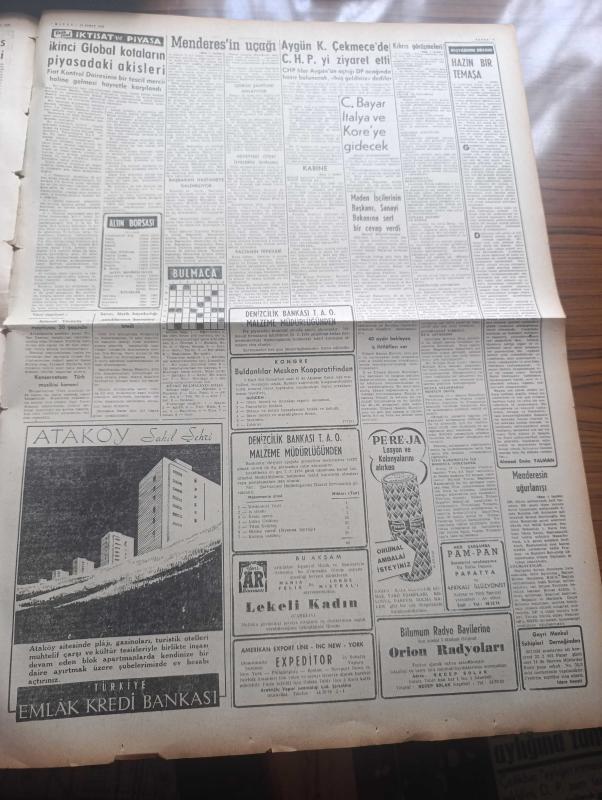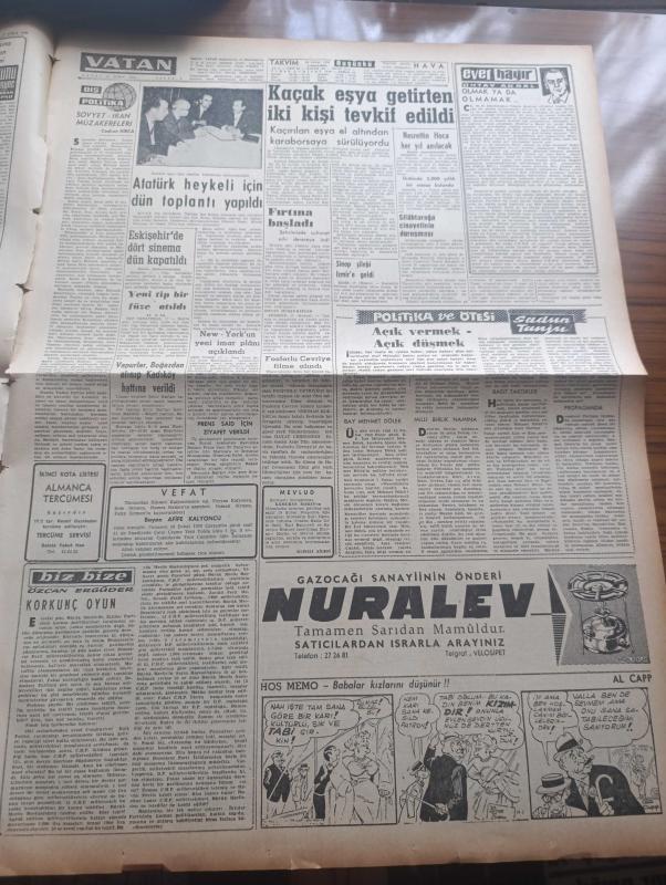 Vatan Gazetesi - Turkish Newspaper - 18 Şubat 1959 - hazin bir temaşa yazan Ahmet Emin Yalman Başmakale - Adnan Menderes'in uçağı Dün Londra civarında sisten düştü 12 ölü var - Türk Hava yolları'nın 4 motorlu SEV uçağı kaza sonunda bir enkaz yığını haline gelmişti fotoğraf - Emin Kalafat ve Arif Demirer Yaralı fotoğraf - Server Somuncuoğlu Ve Kemal Zeytinoğlu öldü - uçakta bulunanların listesi - Melih Esenbelin durumu bilinmiyor - Başbakan Adnan Menderes hareketinden önce Yeşilköy'de uğurlanırken fotoğraf - Kıbrıs görüşmelerine Londra'da başlandı - Kabine Çankaya'da Celal Bayar'ın riyaseti altında toplandı - Orhan Kemal'in bir büyük hikayesi küçücük Yazı Dizisi - Petrol işçileri ile Shell arasında ihtilaf çıktı - Atatürk heykeli için dün toplantı yapıldı fotoğraf - fosforlu Cevriye filme alındı - olmak ya da olmamak yazan Oktay Akbal - Briç masasında cinayet yazan agatha christie yazı dizisi - Celal Bayar İtalya ve Kore'ye gidecek - Vefa Hilmi Kiremitçiyi bırakmayacak fotoğraf adlı eser, Kitap > Süreli Yayınlar > Gazeteler > Türkiye > Genel > Günlük kategorisinde İkinci El olarak satıştadır.