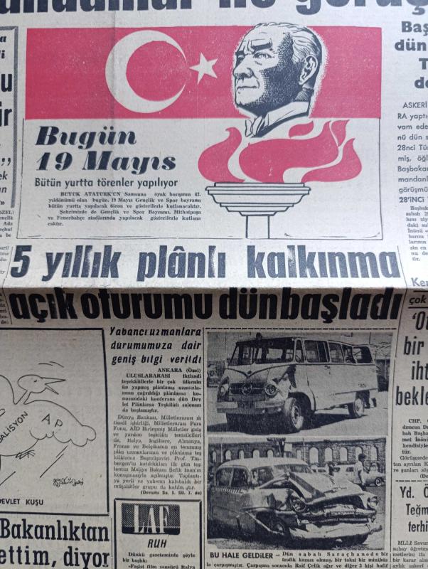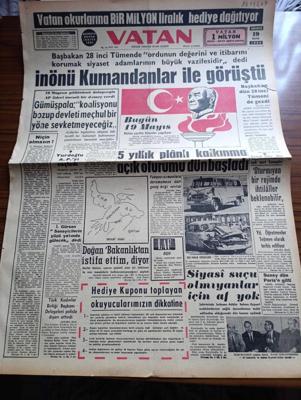 Vatan Gazetesi - Turkish Newspaper - 19 Mayıs 1962 - ne için olmasın yazan Şevket Süreyya Aydemir Başmakale - İsmet İnönü kumandanlar ile görüştü - Bugün 19 Mayıs bütün yurtta törenler yapılıyor - Başbakan İsmet İnönü 28. Tümeni gezdi - Ragıp Gümüşpala koalisyonu bozup devleti meçhul bir yöne sevk etmeyeceğiz dedi - Ticaret Bakanı İhsan Gürsan sanayicilerin yüzü yakında girecek dedi - Lebit Yurdoğlu Adalet Partisini suçladı - 5 yıllık planlı kalkınma açık oturumu dün başladı - CHP genel sekreter yardımcısı Kemal Satır oturmayan bir rejimde ihtilaller beklenebilir - siyasi suçu olmayanlar için af yok - genelkurmay Başkanı Orgeneral Cevdet Sunay Paris'e gitti - Avni Doğan bakanlıktan istifa ettim diyor - Boratav'a cevabım yazan Zeki Velidi Togan - komünist ajanı Eisenhower yazan Oktay Akbal - imparator yeğeni tiyatro oyuncusu Thien Hung fotoğraf - Üç Perdelik cinayet yazan agatha christie çeviren Ülkü Tamer Yazı Dizisi - futbolda ligin baraj düğümü bu hafta çözülüyor - Fenerbahçe, Ahmet Emin Yalman tarafından kaleme alınmıştır. Vatan Gazetesi - Turkish Newspaper - 19 Mayıs 1962 - ne için olmasın yazan Şevket Süreyya Aydemir Başmakale - İsmet İnönü kumandanlar ile görüştü - Bugün 19 Mayıs bütün yurtta törenler yapılıyor - Başbakan İsmet İnönü 28. Tümeni gezdi - Ragıp Gümüşpala koalisyonu bozup devleti meçhul bir yöne sevk etmeyeceğiz dedi - Ticaret Bakanı İhsan Gürsan sanayicilerin yüzü yakında girecek dedi - Lebit Yurdoğlu Adalet Partisini suçladı - 5 yıllık planlı kalkınma açık oturumu dün başladı - CHP genel sekreter yardımcısı Kemal Satır oturmayan bir rejimde ihtilaller beklenebilir - siyasi suçu olmayanlar için af yok - genelkurmay Başkanı Orgeneral Cevdet Sunay Paris'e gitti - Avni Doğan bakanlıktan istifa ettim diyor - Boratav'a cevabım yazan Zeki Velidi Togan - komünist ajanı Eisenhower yazan Oktay Akbal - imparator yeğeni tiyatro oyuncusu Thien Hung fotoğraf - Üç Perdelik cinayet yazan agatha christie çeviren Ülkü Tamer Yazı Dizisi - futbolda ligin baraj düğümü bu hafta çözülüyor - Fenerbahçe adlı eser Türkçe dilindedir.