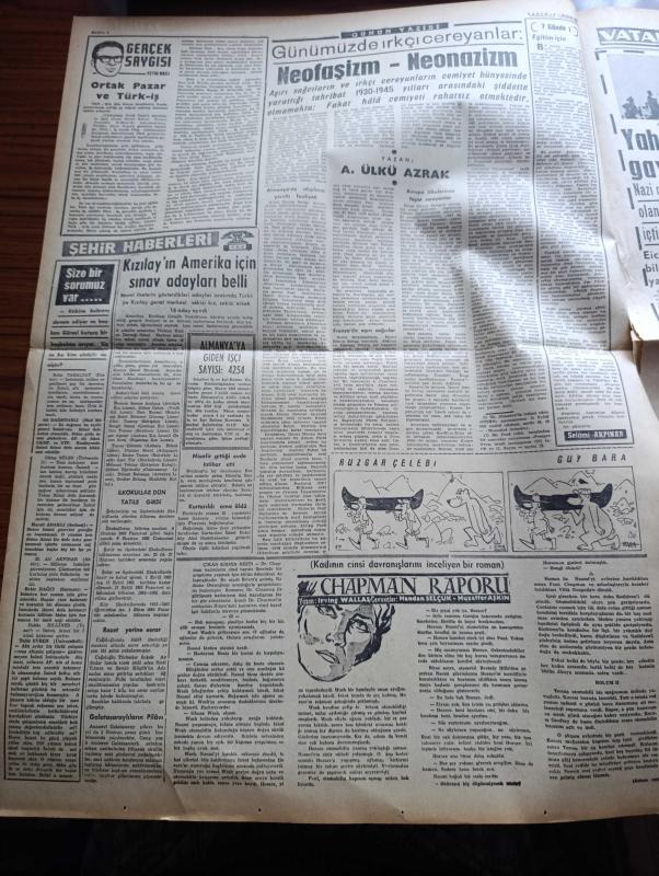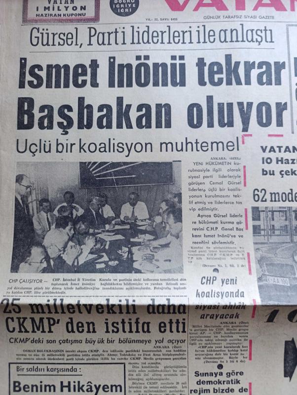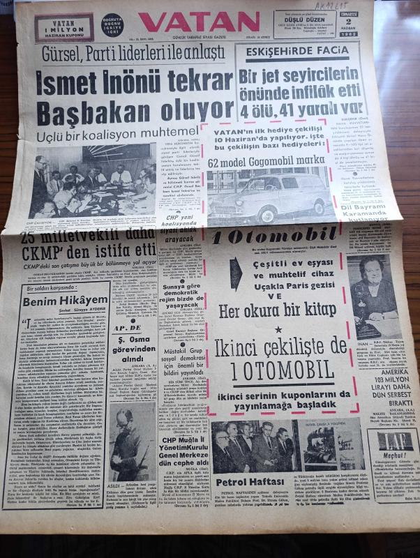 Vatan Gazetesi - Turkish Newspaper - 2 Haziran 1962 - bir saldırı karşısında benim hikayem yazan Şevket Süreyya Aydemir Başmakale - Cemal Gürsel Parti liderleri ile anlaştı - İsmet İnönü tekrar Başbakan oluyor - üçlü koalisyon muhtemel - 25 milletvekili daha Cumhuriyetçi Köylü Millet Partisinden istifa etti - Eskişehir'de facia bir jet seyircilerin önünde infilak etti 4 ölü 41 yaralı var - Dil Bayramı Karaman'da kutlanıyor - Eichman asıldı - Genelkurmay Başkanı Orgeneral Cevdet Sunay'a göre demokratik rejim bizde de yaşayacak - Ortak Pazar ve Türk İş yazan Fethi Naci - Yahudi Kasabı Eichman ölümü gayet soğukkanlılıkla karşıladı fotoğraf - dışarıdaki işçilerimiz yazan Oktay Akbal - Makarios Kennedy ile görüşecek - Üç perdelik cinayet yazan agatha christie çeviren Ülkü Tamer Yazı Dizisi - İstanbul Ankara Radyosu Programı - İtalyan futbolcularına şarap yasak edildi - Şili Dünya kupası'ndan yeni haberler - Brezilya forveti Garrincha Didi Pele Vava Zagalo foto - Hakkı Yeten rakipsiz kaldı, Ahmet Emin Yalman tarafından kaleme alınmıştır. Vatan Gazetesi - Turkish Newspaper - 2 Haziran 1962 - bir saldırı karşısında benim hikayem yazan Şevket Süreyya Aydemir Başmakale - Cemal Gürsel Parti liderleri ile anlaştı - İsmet İnönü tekrar Başbakan oluyor - üçlü koalisyon muhtemel - 25 milletvekili daha Cumhuriyetçi Köylü Millet Partisinden istifa etti - Eskişehir'de facia bir jet seyircilerin önünde infilak etti 4 ölü 41 yaralı var - Dil Bayramı Karaman'da kutlanıyor - Eichman asıldı - Genelkurmay Başkanı Orgeneral Cevdet Sunay'a göre demokratik rejim bizde de yaşayacak - Ortak Pazar ve Türk İş yazan Fethi Naci - Yahudi Kasabı Eichman ölümü gayet soğukkanlılıkla karşıladı fotoğraf - dışarıdaki işçilerimiz yazan Oktay Akbal - Makarios Kennedy ile görüşecek - Üç perdelik cinayet yazan agatha christie çeviren Ülkü Tamer Yazı Dizisi - İstanbul Ankara Radyosu Programı - İtalyan futbolcularına şarap yasak edildi - Şili Dünya kupası'ndan yeni haberler - Brezilya forveti Garrincha Didi Pele Vava Zagalo foto - Hakkı Yeten rakipsiz kaldı adlı eser Türkçe dilindedir.