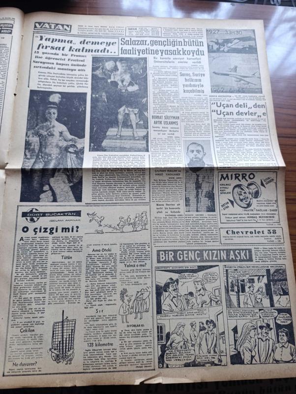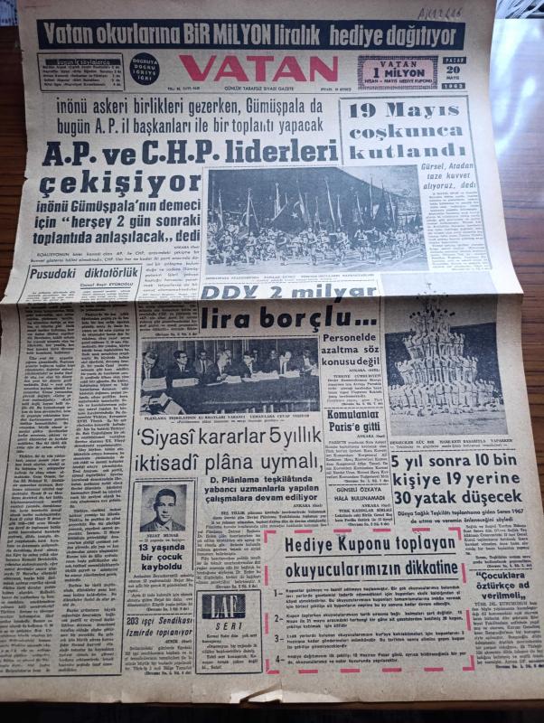 Vatan Gazetesi - Turkish Newspaper - 20 Mayıs 1962 - pusudaki diktatörlük yazan Cemal Reşit Eyüboğlu Başmakale - Adalet Partisi ve Cumhuriyet Halk Partisi liderleri çekişiyor - İsmet İnönü Ragıp Gümüşpala'nın demirci için her şey iki gün sonraki toplantıda anlaşılacak dedi - 19 Mayıs coşkunca kutlandı - Mithatpaşa stadında yapılan dünkü törende okulların bayraktarları fotoğraf - denizciler güç bir hareketi başarıyla yaparken fotoğraf - Devlet Demir yolları 2 milyar lira borçlu - siyasi kararlar 5 yıllık iktisadi plana uymalı - askeri fabrikada iş saati indirildi - Cannes film festivali'nin bitmesine yakın soyunma skandalı fotoğraf - Salazar gençliğin bütün faaliyetine yasak koydu - Meşrutiyet kıraathanesi Yazan Rıfat Ilgaz - Jeff Chandler Ayhan Işık ve Fer Nandel fotoğraf - Üç perdelik cinayet yazan agatha christie çeviren Ülkü Tamer - Yeşildirek Kader maçında Dün Gençlerbirliği de mağlup etti 2 0 - Kasımpaşa 1 Demirspor 0 - Galatasaray yarın kampa gidiyor - Dünya Kupası yaklaşırken, Ahmet Emin Yalman tarafından kaleme alınmıştır. Vatan Gazetesi - Turkish Newspaper - 20 Mayıs 1962 - pusudaki diktatörlük yazan Cemal Reşit Eyüboğlu Başmakale - Adalet Partisi ve Cumhuriyet Halk Partisi liderleri çekişiyor - İsmet İnönü Ragıp Gümüşpala'nın demirci için her şey iki gün sonraki toplantıda anlaşılacak dedi - 19 Mayıs coşkunca kutlandı - Mithatpaşa stadında yapılan dünkü törende okulların bayraktarları fotoğraf - denizciler güç bir hareketi başarıyla yaparken fotoğraf - Devlet Demir yolları 2 milyar lira borçlu - siyasi kararlar 5 yıllık iktisadi plana uymalı - askeri fabrikada iş saati indirildi - Cannes film festivali'nin bitmesine yakın soyunma skandalı fotoğraf - Salazar gençliğin bütün faaliyetine yasak koydu - Meşrutiyet kıraathanesi Yazan Rıfat Ilgaz - Jeff Chandler Ayhan Işık ve Fer Nandel fotoğraf - Üç perdelik cinayet yazan agatha christie çeviren Ülkü Tamer - Yeşildirek Kader maçında Dün Gençlerbirliği de mağlup etti 2 0 - Kasımpaşa 1 Demirspor 0 - Galatasaray yarın kampa gidiyor - Dünya Kupası yaklaşırken adlı eser Türkçe dilindedir.