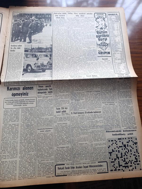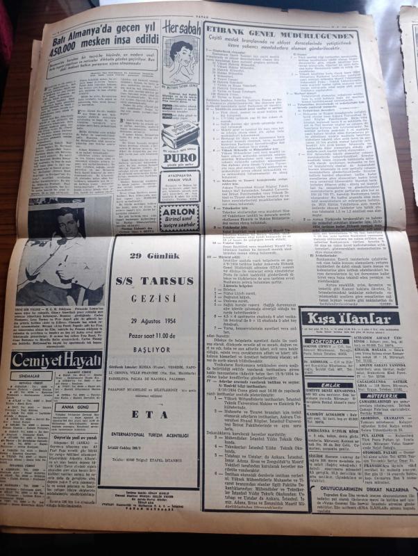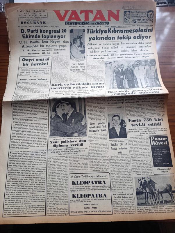 Vatan Gazetesi - Turkish Newspaper - 22 Ağustos 1954 - gayri mesul bir hareket yazan Ahmet Emin Yalman Başmakale - Demokrat Parti Kongresi 20 ekimde toplanıyor - Ticaret bakanı Sıtkı Yırcalı İzmir fuarının açılışında konuşuyor fotoğraf - Türkiye Kıbrıs meselesini yakından takip ediyor - Türk ve buzdolabı satan tacirlerin etikete itirazı - Başvekil Adnan Menderes gazetecilerin yemeğinde bulundu fotoğraf - yeni polislere Dün diploma verildi fotoğraf - Sovyet casusu Yatsikof 30 yıl hapse mahkum oldu - cumhurbaşkanı Celal Bayar'ın Tito'ya Armağan edeceği atlar fotoğraf - Gülhane sergisi hesapları inceleniyor - Boğaziçi sigaraları değişti - Tef mecmuası toplattırıldı - Fahrettin Kerim Gökay İsviçre'de Migrosçularla görüşecek - Amerikalı film artisti Douglas Fairbanks sabah Türkiye'de ayrılıyor Fotoğraf - Osmanlı tarihinde sayfalar yazan Feridun Fazıl Tülbentçi Yazı Dizisi - General Ali Fuat Cebesoy'un siyasi hatıraları Yazı Dizisi - Gina Lollobrigida fotoğraf - Good Year Lastikleri adlı eser, Kitap > Süreli Yayınlar > Gazeteler > Türkiye > Genel > Günlük kategorisinde İkinci El olarak satıştadır.