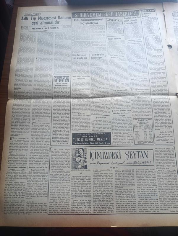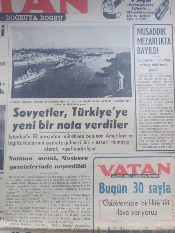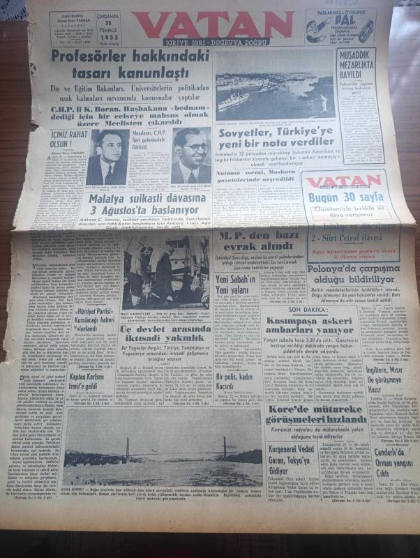 Vatan Gazetesi - Turkish Newspaper - 22 Temmuz 1953 - içiniz rahat olsun yazan Ahmet Emin Yalman Başmakale - profesörler hakkındaki tasarı kanunlaştı - Adnan Menderes CHP ileri gelenleri ile konuştu - meclisten çıkarılan Kamil Boran fotoğraf - Milli eğitim Bakanı Rıfkı Salim burçak fotoğraf - Malatya suikasti davasına 3 Ağustos'ta başlanıyor - Sovyetler Türkiye'ye yeni bir nota verdiler - Millet Partisinden bazı evraklar alındı - Musaddık mezarlıkta bayıldı - Hürriyet Partisi kurulacağı haberi yalanlandı - Yeni Sabah gazetesinin yeni yalanı - Polonya'da çarpışma olduğu bildiriliyor - Kore'de mütareke görüşmeleri hızlandı - Türkiye Yugoslavya ve Yunanistan arasında iktisadi yakınlık - boğaza inşa edilecek asma köprü Ortaköy ile Beylerbeyi arasında köprü maketi fotoğraf - Kasımpaşa askeri ambarları yanıyor - Amerikan filosu bugün geliyor - yeni hava meydanı lokantası Cumhuriyet bayramında açılacak - 38 Halkevi kütüphane oluyor - Celal Bayar'ın kabulü - Piskopos Makarios ile mülakat adlı eser, Kitap > Süreli Yayınlar > Gazeteler > Türkiye > Genel > Günlük kategorisinde İkinci El olarak satıştadır.