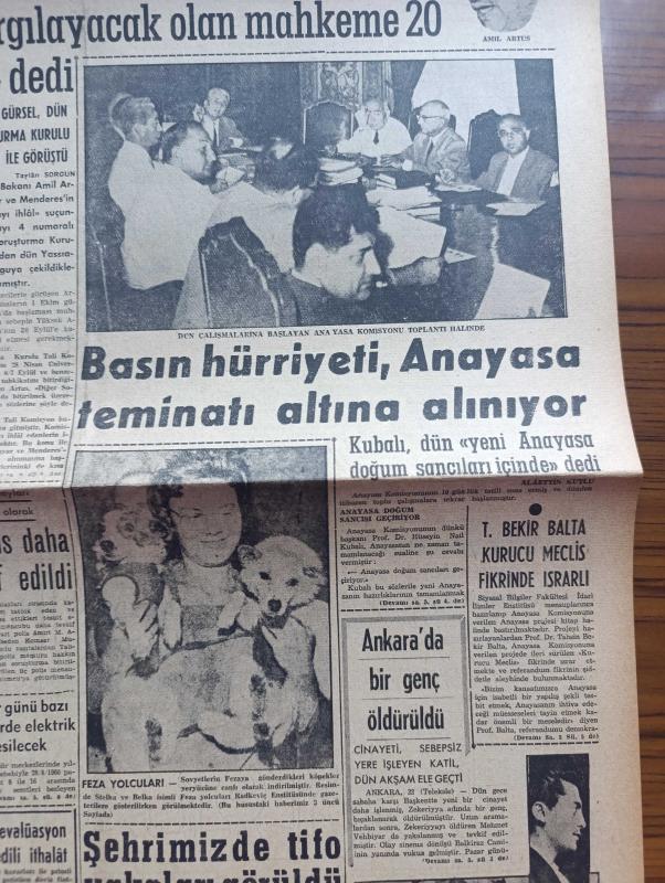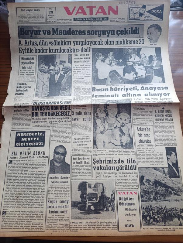 Vatan Gazetesi - Turkish Newspaper - 23 Ağustos 1960 - neredeyiz nereye gidiyoruz yazan Ahmet Emin Yalman Başmakale - Celal Bayar ve Adnan Menderes sorguya çekildi - Amil Artus dün sabıkları yargılayacak olan mahkeme 20 eylül'e kadar kurulacaktır dedi - bakanlar gazetecileri cevaplandırırken fotoğraf - Alparslan Türkeş Kütahya'da istirahate çekildi - basın hürriyeti anayasa teminatı altına alınıyor - Hüseyin Nail Kubalı dün yeni anayasa doğum sancıları içinde dedi - İstanbul'da tifo vakaları görüldü - kaçaklar yazan Kemal Bekir Yazı Dizisi - dev anıtın ayakları dibinde yazan Behçet Kemal Çağlar - yıldızlara doğru yarış süratle devam ediyor - feza'dan dönen hayvanlar dün teşhir edildi fotoğraf - Çanakkale abidesi zamansız açılmıştır - halk oyunları bayramında Yalkuşta ve Çepikli yazan Halil Bedi Yönetken - İstanbul Ankara Radyosu Programı - Beşiktaş Yıldız yolu inşaatında büyük yolsuzluk - apandisit krizi geçiren güreşçi Müzahir Sille hastanede - Fenerbahçe bu yıl kampa girmeyecek, Ahmet Emin Yalman tarafından kaleme alınmıştır. Vatan Gazetesi - Turkish Newspaper - 23 Ağustos 1960 - neredeyiz nereye gidiyoruz yazan Ahmet Emin Yalman Başmakale - Celal Bayar ve Adnan Menderes sorguya çekildi - Amil Artus dün sabıkları yargılayacak olan mahkeme 20 eylül'e kadar kurulacaktır dedi - bakanlar gazetecileri cevaplandırırken fotoğraf - Alparslan Türkeş Kütahya'da istirahate çekildi - basın hürriyeti anayasa teminatı altına alınıyor - Hüseyin Nail Kubalı dün yeni anayasa doğum sancıları içinde dedi - İstanbul'da tifo vakaları görüldü - kaçaklar yazan Kemal Bekir Yazı Dizisi - dev anıtın ayakları dibinde yazan Behçet Kemal Çağlar - yıldızlara doğru yarış süratle devam ediyor - feza'dan dönen hayvanlar dün teşhir edildi fotoğraf - Çanakkale abidesi zamansız açılmıştır - halk oyunları bayramında Yalkuşta ve Çepikli yazan Halil Bedi Yönetken - İstanbul Ankara Radyosu Programı - Beşiktaş Yıldız yolu inşaatında büyük yolsuzluk - apandisit krizi geçiren güreşçi Müzahir Sille hastanede - Fenerbahçe bu yıl kampa girmeyecek adlı eser Türkçe dilindedir.