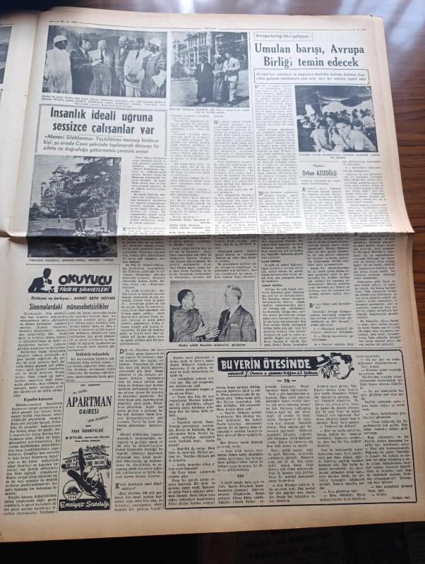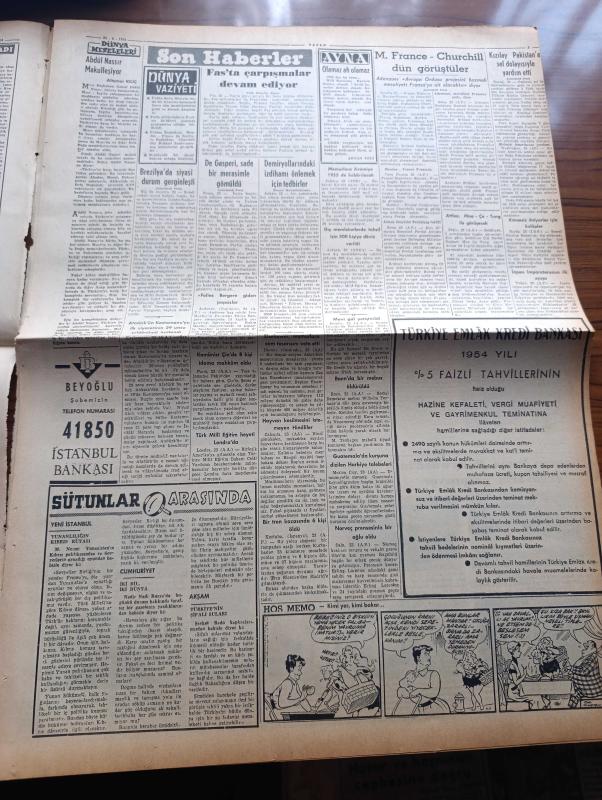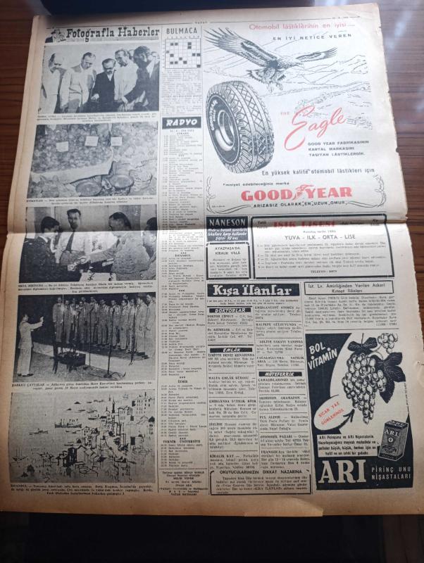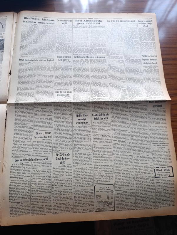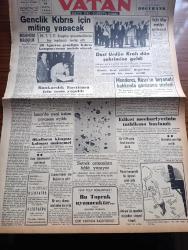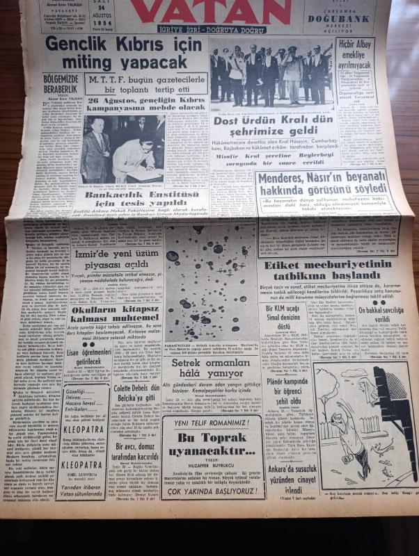 Vatan Gazetesi - Turkish Newspaper - 24 Ağustos 1954 - bölgemizde beraberlik yazan Ahmet Emin Yalman Başmakale - gençlik Kıbrıs için miting yapacak - Türkiye İş Bankası Umum Müdürü Üzeyir Avunduk bankacılık enstitüsü'ne ait senedi imzalarken fotoğraf - dost Ürdün kralı Kral Hüseyin İstanbul'a geldi fotoğraf - Hiçbir Albay emekliye ayrılmayacak - Adnan Menderes Nasır'ın beyanatı hakkında görüşünü söyledi - Setrek ormanları hala yanıyor - liselerin onbir yıla indirilmesi iyi karşılandı - Fasta çarpışmalar devam ediyor - Attlee Mao Çe Tung ile görüşecek - Romanya güzeli Magda Demetrescu öldürüldü fotoğraf - Kaptan Nemo hollywood'lu canavarla çarpışıyor fotoğraflar - Galatasaray Fenerbahçe kulüpleri anlaşacak - yeni su sporları ajanı İskender Songur seçildi - Hilton otelinin mefruşat masrafı 500 bin lirayı buldu - enternasyonel tenis karşılaşmaları - Bir Avcı domuz tarafından kaçırıldı - Ankara İstanbul İzmir Teknik Üniversite radyo programı - Good Year Lastik - Işık Lisesi kayıtları adlı eser, Kitap > Süreli Yayınlar > Gazeteler > Türkiye > Genel > Günlük kategorisinde İkinci El olarak satıştadır.