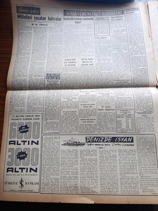 Vatan Gazetesi - Turkish Newspaper - 24 Ağustos 1954 - bölgemizde beraberlik yazan Ahmet Emin Yalman Başmakale - gençlik Kıbrıs için miting yapacak - Türkiye İş Bankası Umum Müdürü Üzeyir Avunduk bankacılık enstitüsü'ne ait senedi imzalarken fotoğraf - dost Ürdün kralı Kral Hüseyin İstanbul'a geldi fotoğraf - Hiçbir Albay emekliye ayrılmayacak - Adnan Menderes Nasır'ın beyanatı hakkında görüşünü söyledi - Setrek ormanları hala yanıyor - liselerin onbir yıla indirilmesi iyi karşılandı - Fasta çarpışmalar devam ediyor - Attlee Mao Çe Tung ile görüşecek - Romanya güzeli Magda Demetrescu öldürüldü fotoğraf - Kaptan Nemo hollywood'lu canavarla çarpışıyor fotoğraflar - Galatasaray Fenerbahçe kulüpleri anlaşacak - yeni su sporları ajanı İskender Songur seçildi - Hilton otelinin mefruşat masrafı 500 bin lirayı buldu - enternasyonel tenis karşılaşmaları - Bir Avcı domuz tarafından kaçırıldı - Ankara İstanbul İzmir Teknik Üniversite radyo programı - Good Year Lastik - Işık Lisesi kayıtları, Ahmet Emin Yalman tarafından kaleme alınmıştır. Vatan Gazetesi - Turkish Newspaper - 24 Ağustos 1954 - bölgemizde beraberlik yazan Ahmet Emin Yalman Başmakale - gençlik Kıbrıs için miting yapacak - Türkiye İş Bankası Umum Müdürü Üzeyir Avunduk bankacılık enstitüsü'ne ait senedi imzalarken fotoğraf - dost Ürdün kralı Kral Hüseyin İstanbul'a geldi fotoğraf - Hiçbir Albay emekliye ayrılmayacak - Adnan Menderes Nasır'ın beyanatı hakkında görüşünü söyledi - Setrek ormanları hala yanıyor - liselerin onbir yıla indirilmesi iyi karşılandı - Fasta çarpışmalar devam ediyor - Attlee Mao Çe Tung ile görüşecek - Romanya güzeli Magda Demetrescu öldürüldü fotoğraf - Kaptan Nemo hollywood'lu canavarla çarpışıyor fotoğraflar - Galatasaray Fenerbahçe kulüpleri anlaşacak - yeni su sporları ajanı İskender Songur seçildi - Hilton otelinin mefruşat masrafı 500 bin lirayı buldu - enternasyonel tenis karşılaşmaları - Bir Avcı domuz tarafından kaçırıldı - Ankara İstanbul İzmir Teknik Üniversite radyo programı - Good Year Lastik - Işık Lisesi kayıtları adlı eser Türkçe dilindedir.