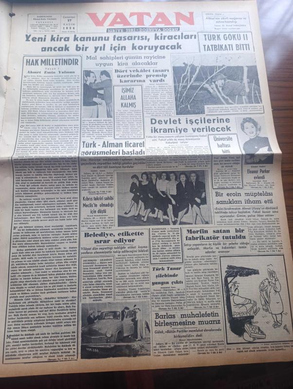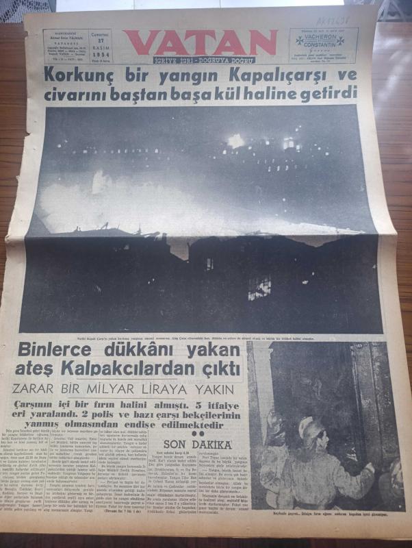 Vatan Gazetesi - Turkish Newspaper - 27 Kasım 1954 - korkunç bir yangın kapalıçarşı ve civarını baştan başa kül haline getirdi fotoğraf - binlerce dükkanı yakan ateş kalpakçılardan çıktı zarar 1 milyar liraya yakın - itfaiye fırın ağzını andıran kapıdan içeri giremiyor fotoğraf - 5 itfaiye eri yaralandı 2 polis ve bazı Çarşı bekçilerinin yanmış olmasından endişe ediliyor - otomobil sevdası Yazan İsmail Ateş Yazı Dizisi - Florence Nightingale İstanbul tesisi müteşebbis heyeti toplandı - hak milletindir yazan Ahmet Emin Yalman Başmakale - Türk Gökü II tatbikati bitti - Adnan Menderes pakistan'a gidecek - Bedii Faik tekrar tahliye talep edecek - Türkiye ile Arap Devletleri arasında karayolu yapılacak - sanat aleminde yazan Ercüment Berker - Vörös Lobogo üçüncü maçını bugün Fenerbahçe ile yapıyor - dünya güreş şampiyonası - İngiliz futbolcuların muhtemel grevi - sporcu Erol Erükal'ın centilmenliği - futbol sahalarına kauçuk döşenecek - Morfin satan fabrikatör Necati Sarvazlar tutuldu, Ahmet Emin Yalman tarafından kaleme alınmıştır. Vatan Gazetesi - Turkish Newspaper - 27 Kasım 1954 - korkunç bir yangın kapalıçarşı ve civarını baştan başa kül haline getirdi fotoğraf - binlerce dükkanı yakan ateş kalpakçılardan çıktı zarar 1 milyar liraya yakın - itfaiye fırın ağzını andıran kapıdan içeri giremiyor fotoğraf - 5 itfaiye eri yaralandı 2 polis ve bazı Çarşı bekçilerinin yanmış olmasından endişe ediliyor - otomobil sevdası Yazan İsmail Ateş Yazı Dizisi - Florence Nightingale İstanbul tesisi müteşebbis heyeti toplandı - hak milletindir yazan Ahmet Emin Yalman Başmakale - Türk Gökü II tatbikati bitti - Adnan Menderes pakistan'a gidecek - Bedii Faik tekrar tahliye talep edecek - Türkiye ile Arap Devletleri arasında karayolu yapılacak - sanat aleminde yazan Ercüment Berker - Vörös Lobogo üçüncü maçını bugün Fenerbahçe ile yapıyor - dünya güreş şampiyonası - İngiliz futbolcuların muhtemel grevi - sporcu Erol Erükal'ın centilmenliği - futbol sahalarına kauçuk döşenecek - Morfin satan fabrikatör Necati Sarvazlar tutuldu adlı eser Türkçe dilindedir.