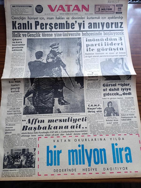Vatan Gazetesi - Turkish Newspaper - 28 Nisan 1962 - gençliğin Hürriyet için insan hakları ve devrimleri kurtarmak için ayaklandığı kanlı perşembeyi anıyoruz - İsmet İnönü Dün 3 parti lideri ile görüştü - kaba ve kara kuvvete karşı direnen gençliğin önünde emniyet Kuvvetleri seferber edilmişti fotoğraf - eski milli birlik komitesi üyeleri gençliği kutladı - Cemal Gürsel işler af dahil iyiye gidecek dedi fotoğraf - Adalet Partili Nebahat Aslan Tevkif edildi - adalet bakanı Sahir Kurutluoğlu affın mesuliyeti başbakana ait dedi - 14'lerden Rifat Baykal yarın geliyor - Pil davasını Anayasa mahkemesi görecek - Darülaceze müdürü Turgut Aytuğrul'un başka göreve atanması protesto edildi fotoğraf - Münir Özkul turnede fotoğraf - 28 Nisan bir başlangıçtır yazan Oktay Akbal - İstanbul Ankara Radyosu Programı - Üç perdelik cinayet yazan agatha christie çeviren Ülkü Tamer Yazı Dizisi - Metin Oktay kati olarak Galatasaray'a dönecek - Matthews'li Stoke City geliyor - Can Bartunun düğünü fotoğraflar, Ahmet Emin Yalman tarafından kaleme alınmıştır. Vatan Gazetesi - Turkish Newspaper - 28 Nisan 1962 - gençliğin Hürriyet için insan hakları ve devrimleri kurtarmak için ayaklandığı kanlı perşembeyi anıyoruz - İsmet İnönü Dün 3 parti lideri ile görüştü - kaba ve kara kuvvete karşı direnen gençliğin önünde emniyet Kuvvetleri seferber edilmişti fotoğraf - eski milli birlik komitesi üyeleri gençliği kutladı - Cemal Gürsel işler af dahil iyiye gidecek dedi fotoğraf - Adalet Partili Nebahat Aslan Tevkif edildi - adalet bakanı Sahir Kurutluoğlu affın mesuliyeti başbakana ait dedi - 14'lerden Rifat Baykal yarın geliyor - Pil davasını Anayasa mahkemesi görecek - Darülaceze müdürü Turgut Aytuğrul'un başka göreve atanması protesto edildi fotoğraf - Münir Özkul turnede fotoğraf - 28 Nisan bir başlangıçtır yazan Oktay Akbal - İstanbul Ankara Radyosu Programı - Üç perdelik cinayet yazan agatha christie çeviren Ülkü Tamer Yazı Dizisi - Metin Oktay kati olarak Galatasaray'a dönecek - Matthews'li Stoke City geliyor - Can Bartunun düğünü fotoğraflar adlı eser Türkçe dilindedir.