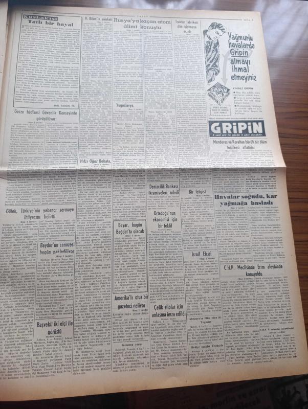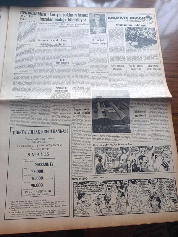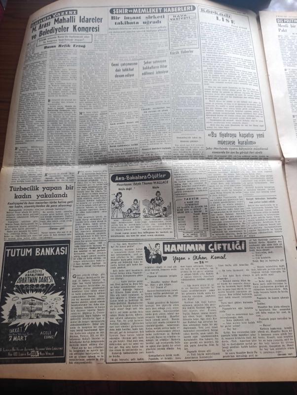 Vatan Gazetesi - Turkish Newspaper - 5 Mart 1955 - Bir ıslahat hamlesi yazan Ahmet Emin Yalman Başmakale - Adnan Menderes ve Refik Koraltan büyük bir ölüm tehlikesi atlattılar - Adnan Menderes'in bindiği otomobil demir yolu üzerinde raylar üzerinde kaldı - traktör fabrikası dün işletmeye açıldı - Kasım Gülek Türkiye'nin yabancı sermaye ihtiyacını belirtti - CHP meclisinde Nihat Erim aleyhinde konuşuldu - Hıfzı Oğuz Bekata Nihat Erim'i münazaraya çağırdı - Londra büyükelçimiz Hikmet Bayur'un cenazesi bugün naklediliyor - Gazze hadisesi güvenlik konseyinde görüşülüyor - Profesör Afet İnan'ın Konferansı fotoğraf - Edebiyatçılar birliği hakkında izahat verildi - Bir fetişist yakalandı - hanımın çiftliği yazan Orhan Kemal Yazı Dizisi - Mümtaz Faik Fenik Zafer gazetesinden ayrılıyor - geçmişte bugün Stalin'in ölümü yazan Feridun Fazıl Tülbentçi - Şah İsmail yazan Feridun Fazıl Tülbentçi Yazı Dizisi - Sanat Aleminde Yazan Zahir Güvemli - her gün bir yıldız Kirk Douglas fotoğraf - Sinerama adlı eser, Kitap > Süreli Yayınlar > Gazeteler > Türkiye > Genel > Günlük kategorisinde İkinci El olarak satıştadır.